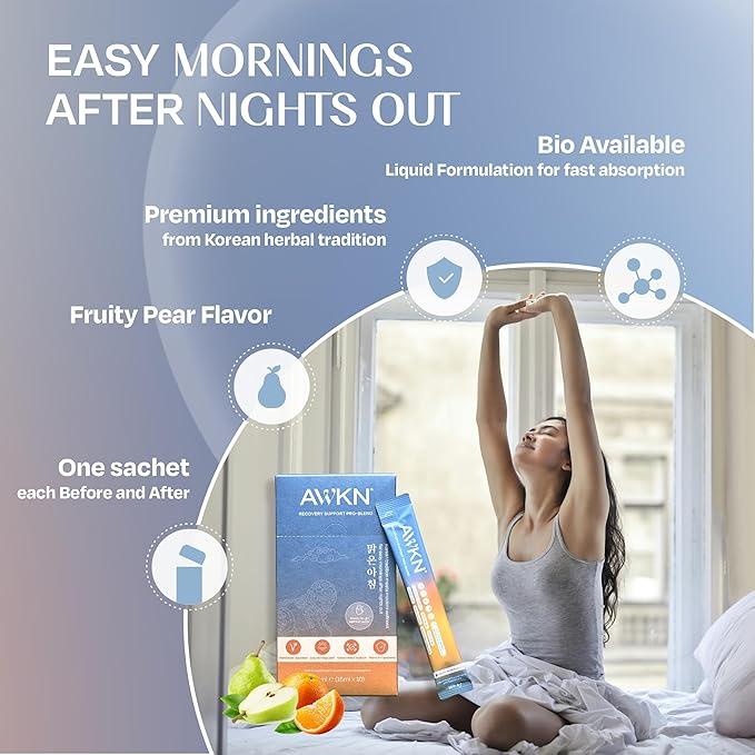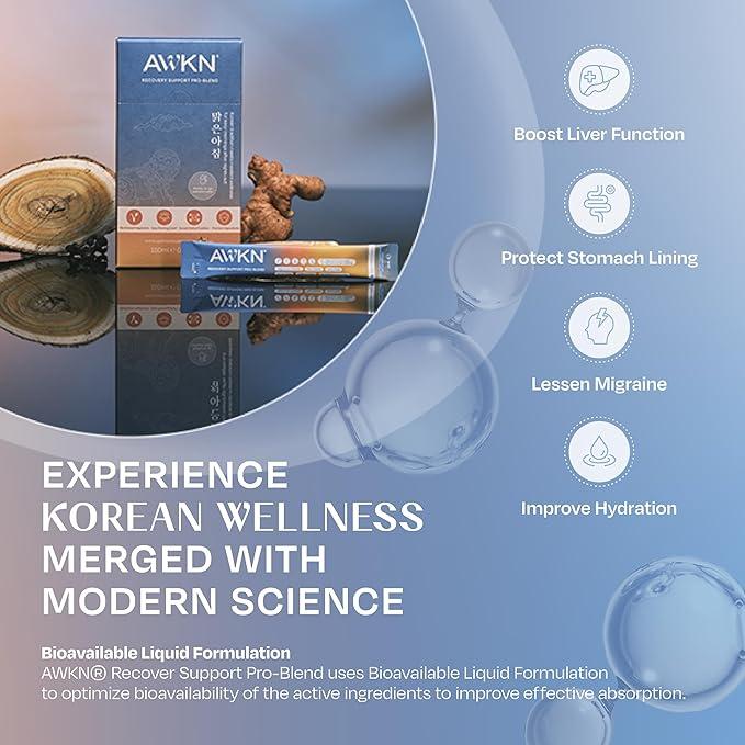 AWKN Morning Recovery Drink - Milk Thistle, Korean Ginseng and Probiotics Pre-Drinking Shot - 10 Liquid Sachets