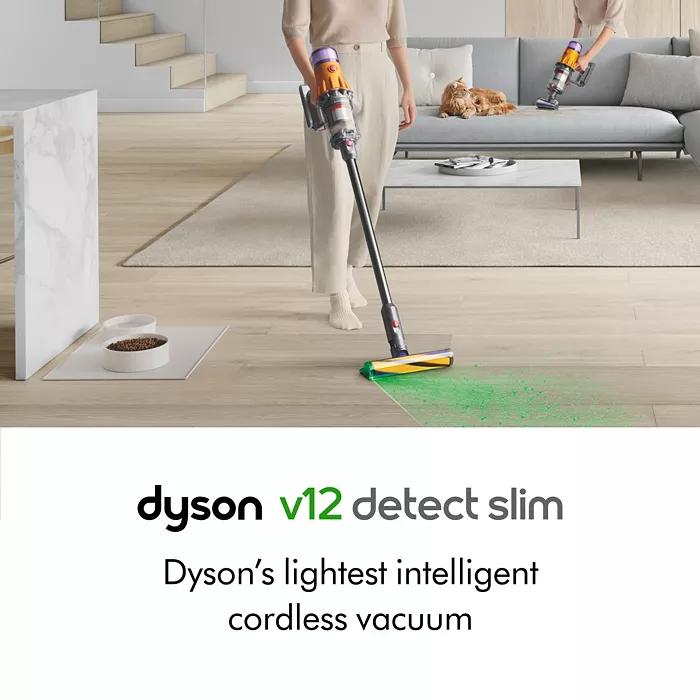 The Dyson V12 Detect Slim is Dyson's lightest intelligent cordless vacuum. It's engineered with the power, intelligence, versatility, and run time to deep clean your whole home in a lightweight, compact format. Dyson illumination reveals invisible dust on hard floors. The Dyson V12 Detect Slim intelligently optimizes power and run time based on the debris picked up, reporting it all on the LCD screen.