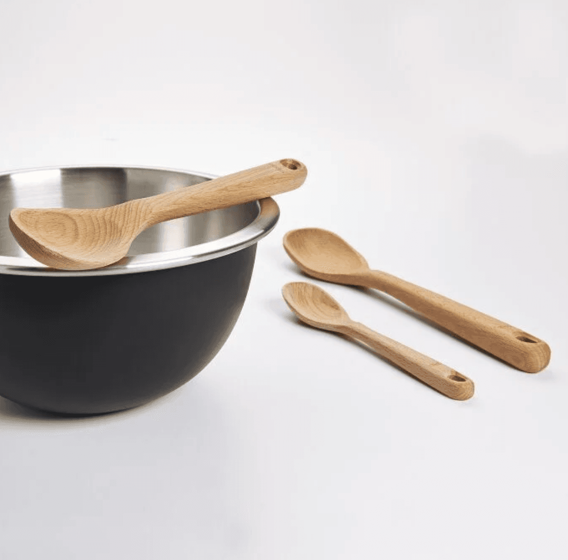 This set includes Large, Medium and Small Spoons. Our wooden utensils are made of solid, one-piece beech wood. Their distinctive straight-sided shape allows better reach in cookware. A natural oil finish coats and protects the wood. Safe for non-stick cookware. Hand wash only.