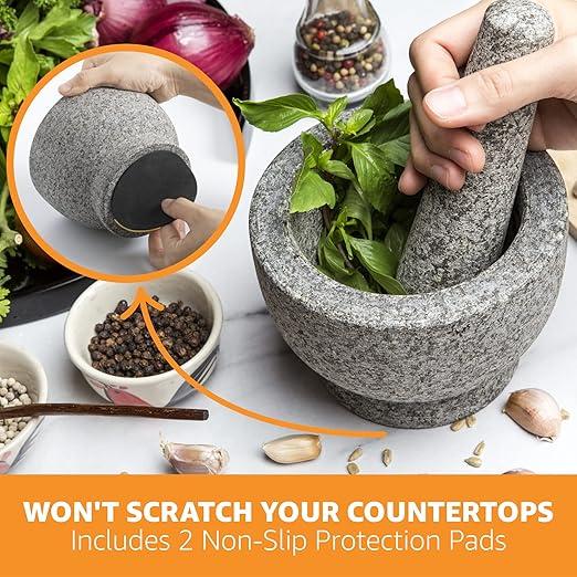 Heavy Duty 100% Granite Mortar and Pestle Set, Non-Slip Base, Make Fresh Guacamole at Home, Solid Stone Grinder Bowl, Herb Crusher, Spice Grinder, Unpolished Grey, 1.5 Cup, Grey