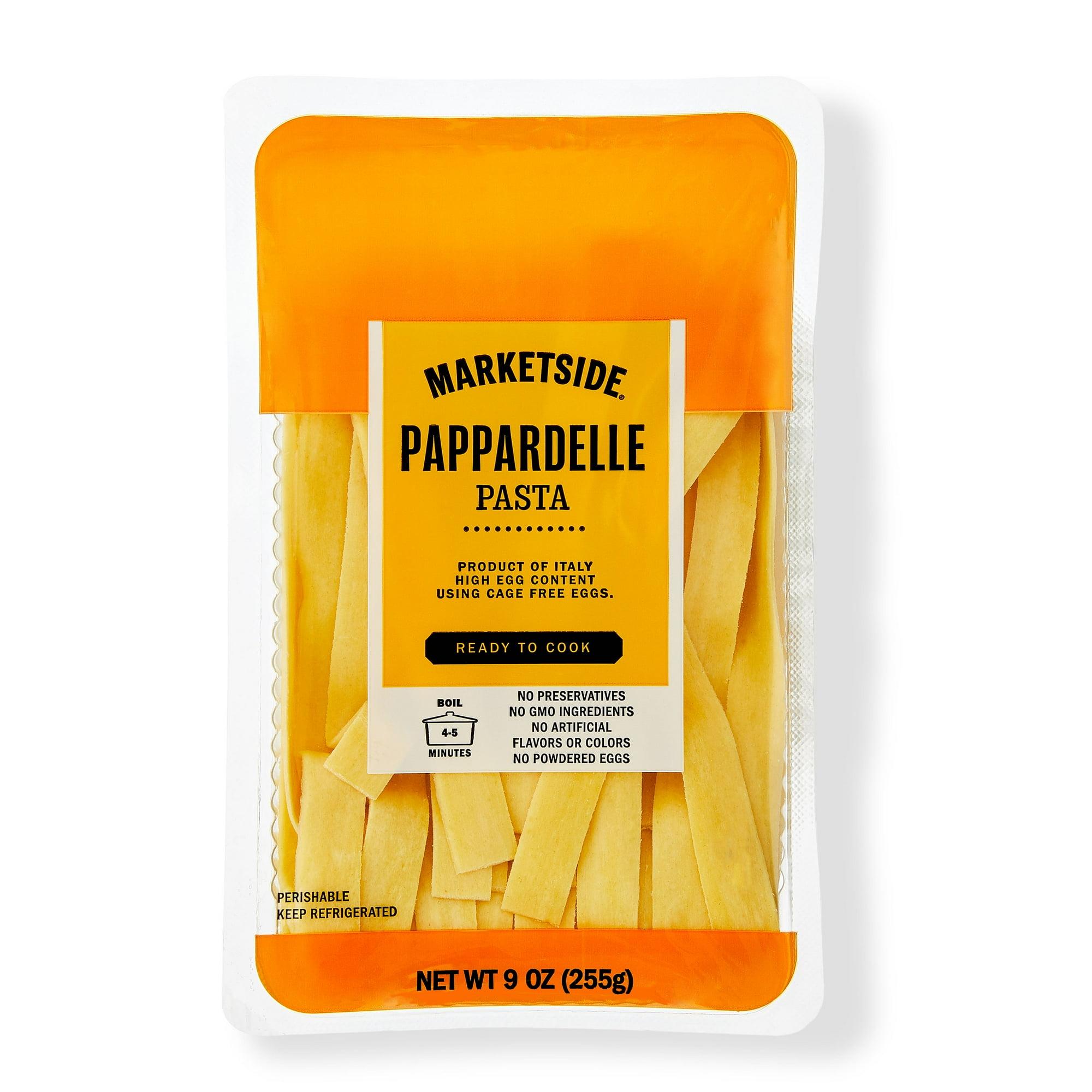 Marketside Fresh Pappardelle Pasta, 9 oz. Features thick, wide ribbons of pasta. Made in Italy using traditional Sicilian recipes. Includes high-quality ingredients like cage-free eggs, tender flour, and durum wheat semolina