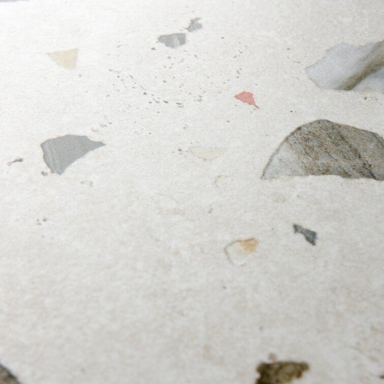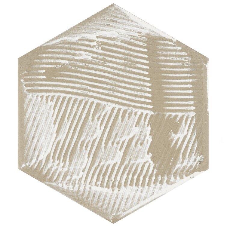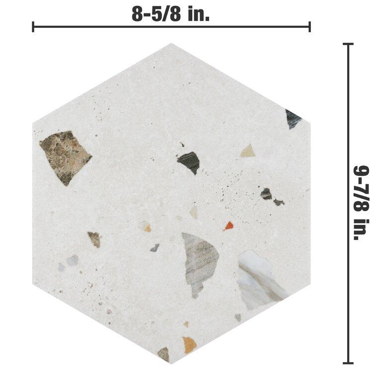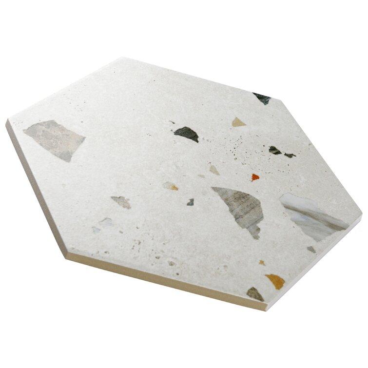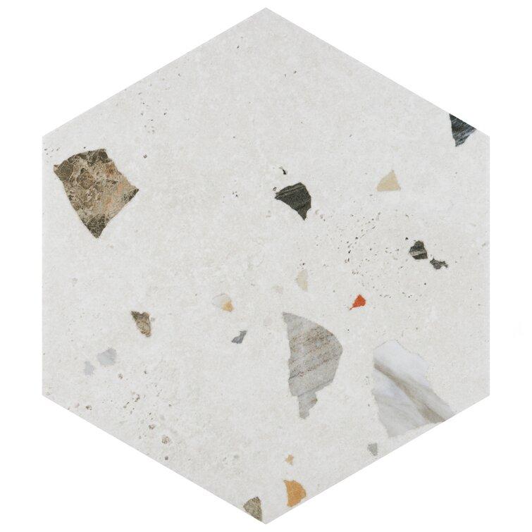 Replicating a worn concrete appearance with floating fragments of large stones, our sonar hex white porcelain floor, and wall tile lends a burst of terrazzo-look energy to any space.