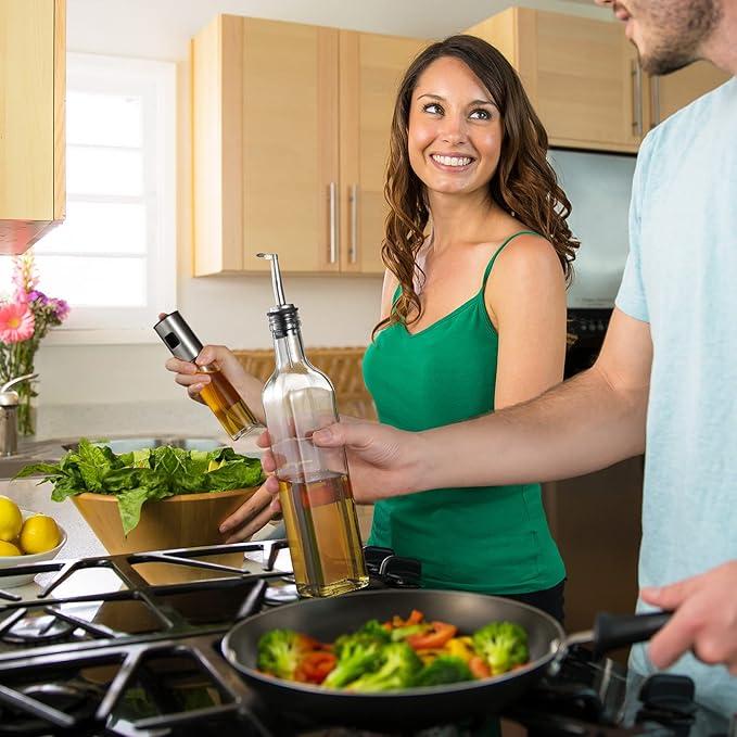 Olive Oil Dispenser 17 OZ and Oil Sprayer for Cooking - Vinegar Cruet Bottle Set for Kitchen - Glass container with Drip-Free Stainless Steel Spout - Oil Mister for Air Fryer, Salad