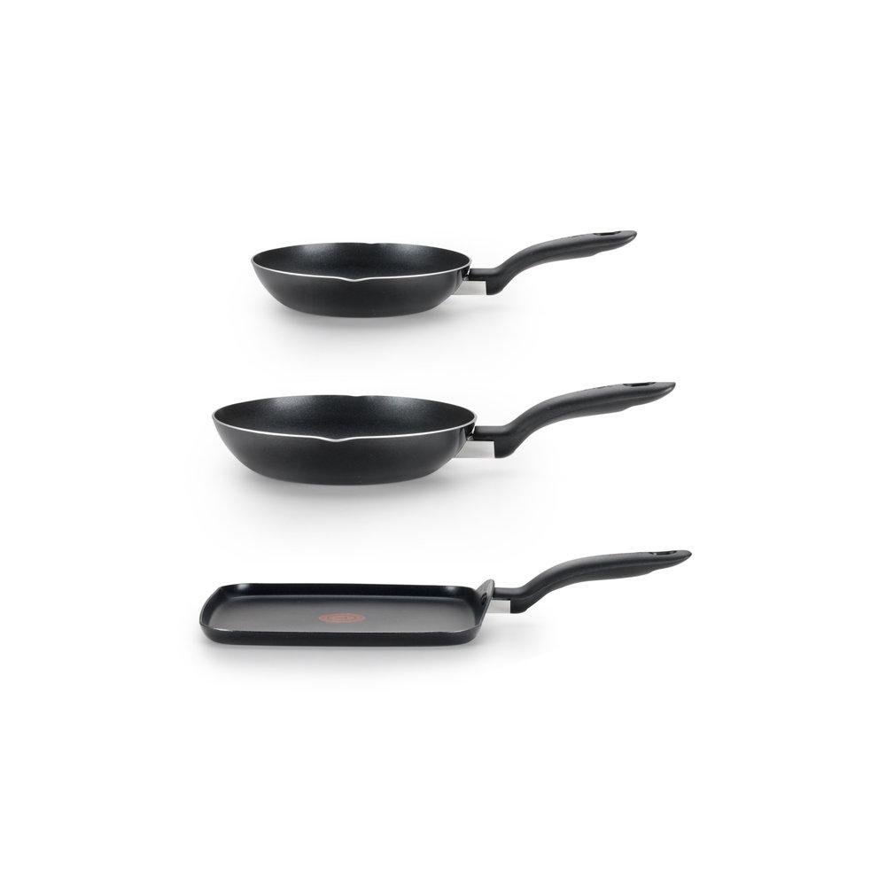 T-fal culinaire non-stick 3-piece set is designed with the everyday chef in mind. Includes 8" frypan, 9" frypan, 10.25" griddle, which stacks to save space in kitchen cabinets. Pro-Glide non-stick interior ensures easy food release and enables healthy cooking with little to no oil.