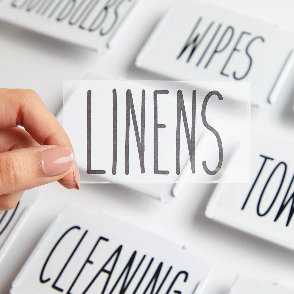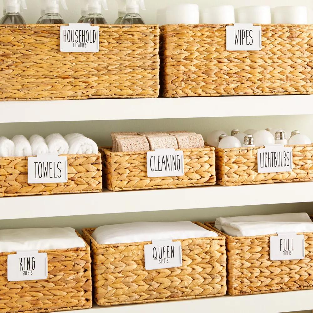 Organize and declutter your home, workspace, or craft area with our set of 70 preprinted home labels for organization that includes 8 white metal bin clip labels holders and 1 reference sheet with a complete list of names included for each label. No more messy handwriting! Our removable labels for storage bins feature over 70 everyday essentials, from vitamins and sewing to pet care, or household cleaning, you’ll find them all!
