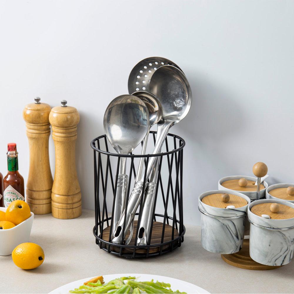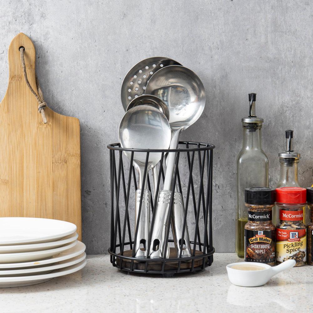 An angled black metal wire basket-style holder with a wooden base, designed to showcase modern kitchen decor on countertops. **Utensils NOT included**. This utensils crock is the perfect solution for holding cooking, food preparation, and baking tools, including spatulas, turners, ladles, tongs, whisks, and wooden spoons, ensuring they're within easy reach when you need them.