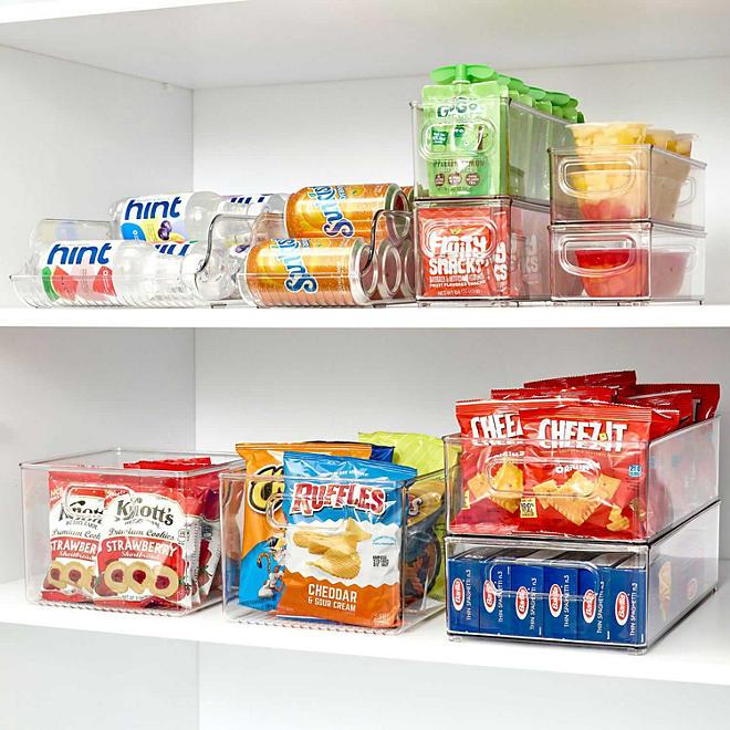 The bins can be used on their own or stacked together to maximize storage space on shelves or deeper drawers, and they are ideal for storing fruit, vegetables, dairy, condiments, snacks, and more. The open-top design and transparent sides keep items stored inside visible and accessible at all times, while the integrated handles provide portability and quick reorganization. The soda organizer holds up to 9 standard-sized beverage cans such as soda, sparkling water, juice, tea, and beer, while the bottle bin holds up to 9 larger beverages such as water bottles, sports drinks, energy drinks and hard seltzers.