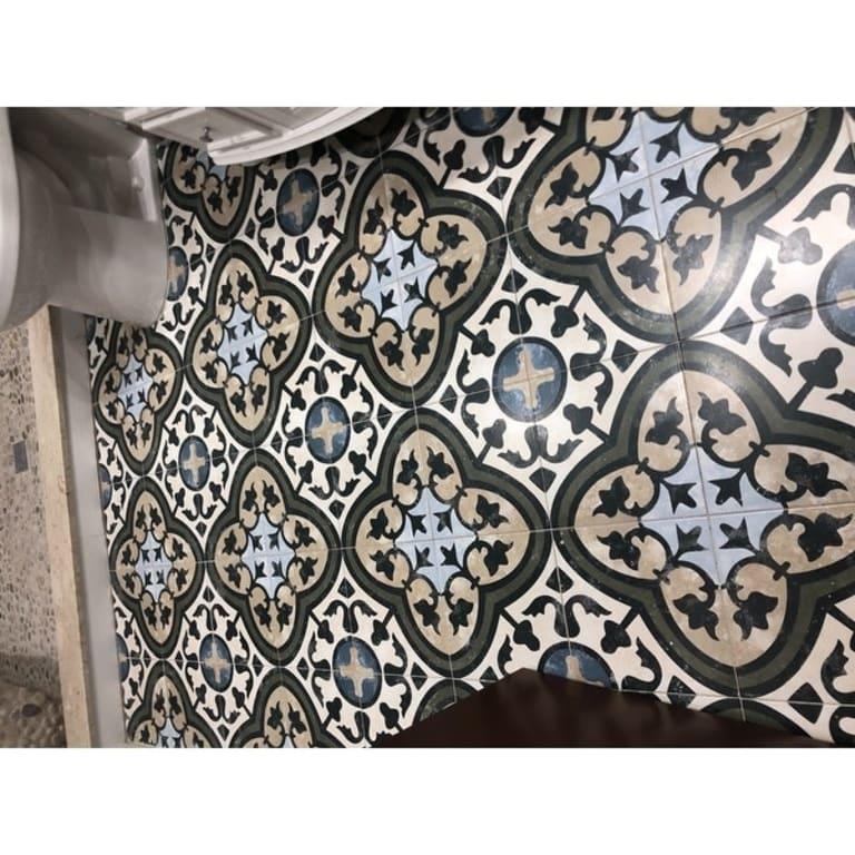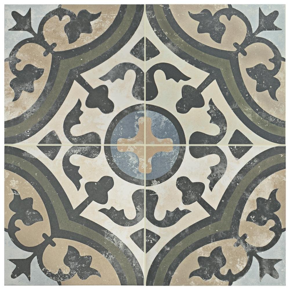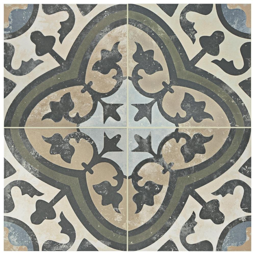 Inspired by artisan cement tiles, our Evoque Carthusian Porcelain Floor and Wall Tile captures the look of authentic encaustic tiles. Crafted in Spain, this porcelain tile features a large floral old-world pattern in varying shades of faded charcoal black, light blue, forest green and tan that frames dueling arcs in the center, offering subtle contrast and dimension to the decoration.