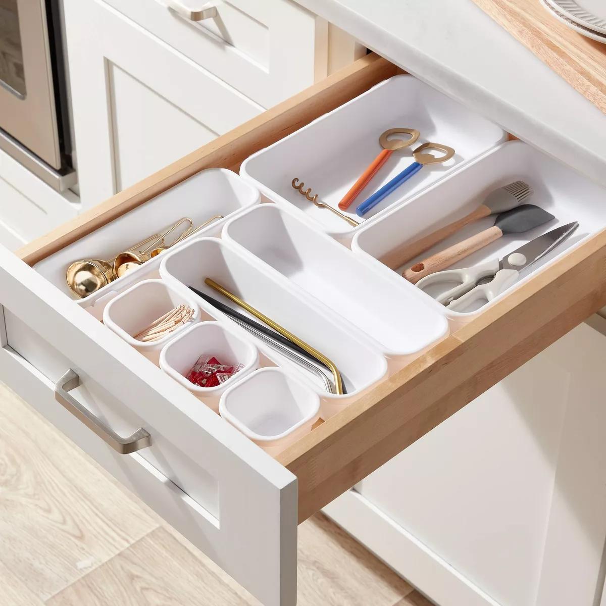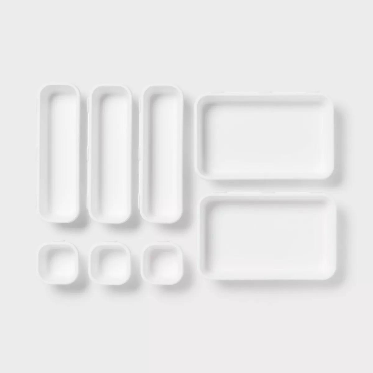 Create extra space within a drawer while keeping small items separate with the 8-Piece Plastic Drawer Organizer Set from Brightroom™. This white drawer organizer set includes eight organizers in varying shapes and sizes to fit nicely inside a drawer. Made with plastic, this drawer organizer set makes a practical addition to your space, and allows easy cleanup with its dishwasher-safe design.