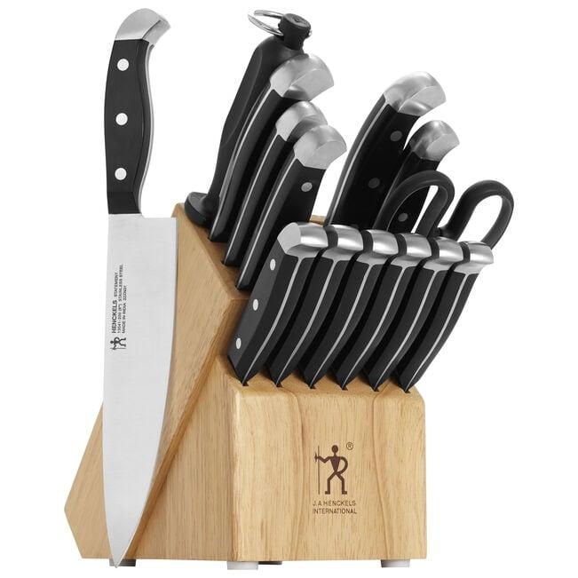 The 15-piece knife block set features all the tools you need to start your kitchen out right. This block set includes the all-rounder 8-inch chef’s knife, which is perfect for chopping herbs and dicing onions, and 5-inch serrated utility knife, ideal for cutting soft interior, hard exterior foods. Efficiently mince garlic with the hollow edge santoku, featuring a blade that has small indentations, known as grantons, that prevent food from sticking while cutting.