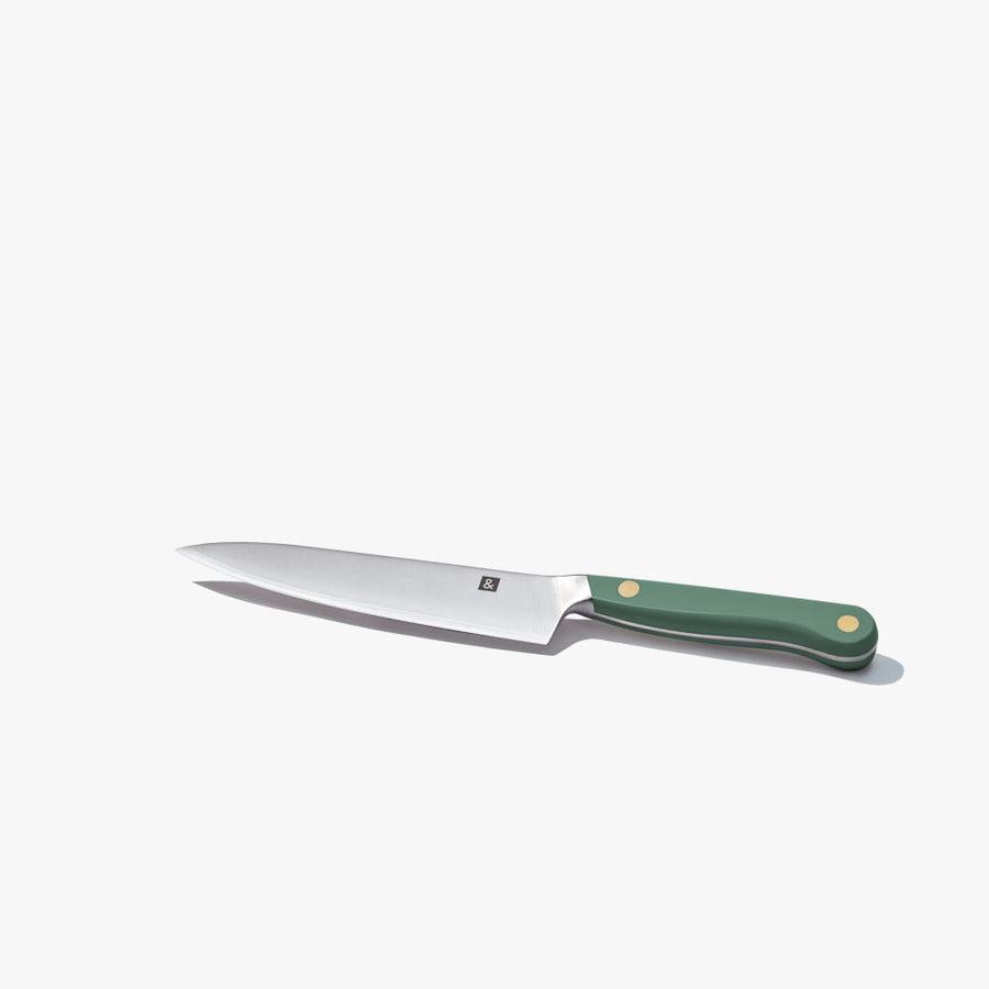 This Utility Knife is one of our favorite tools, and we designed this one with the help of top chefs to get every detail right. Easier to maneuver than a Chef’s Knife, and more versatile than a paring knife, the Utility Knife has just the right proportions to feel nimble in your hand for the small stuff (cocktail wedge, anyone?), but big enough to take on bigger jobs too (like breaking down your whole farmers’ market haul).