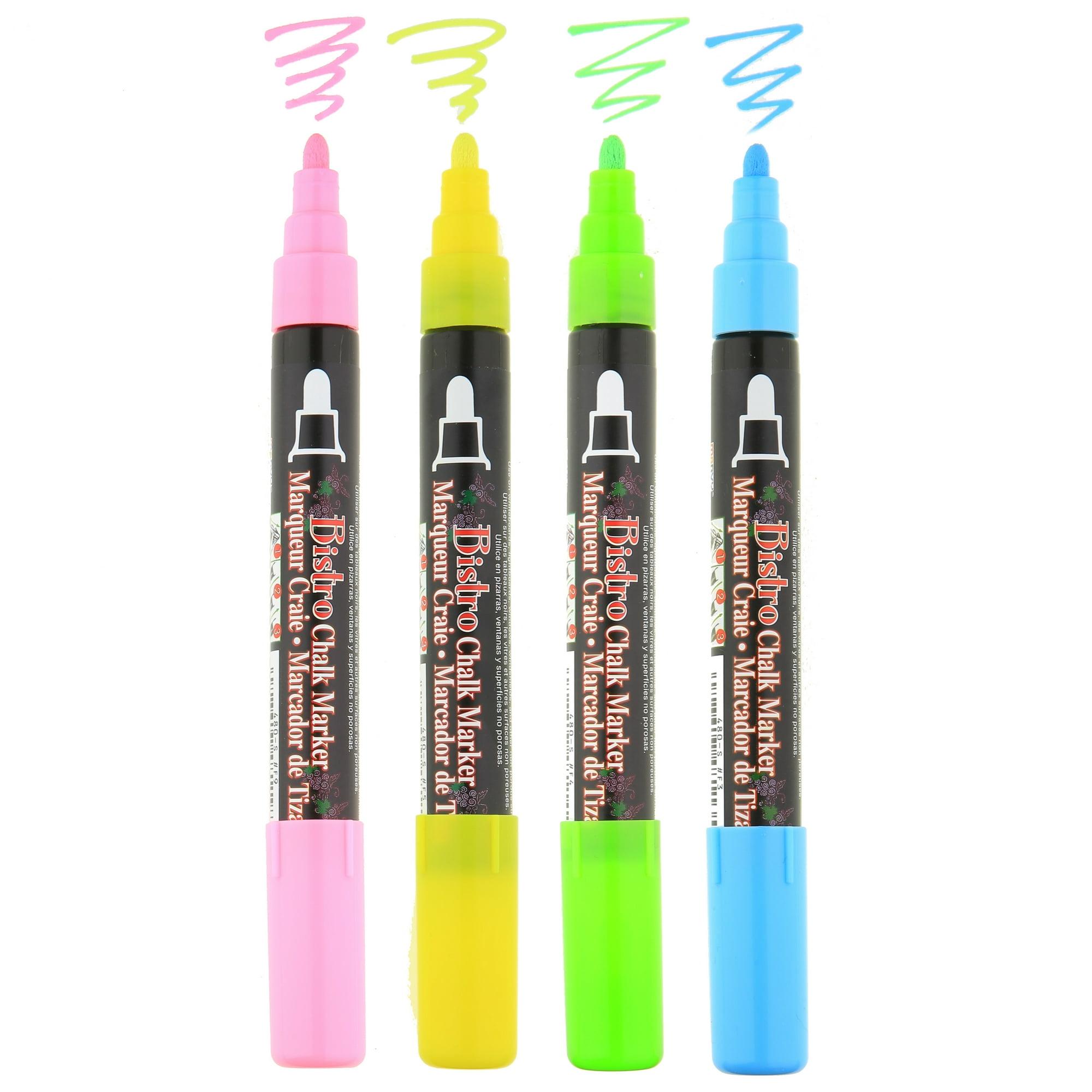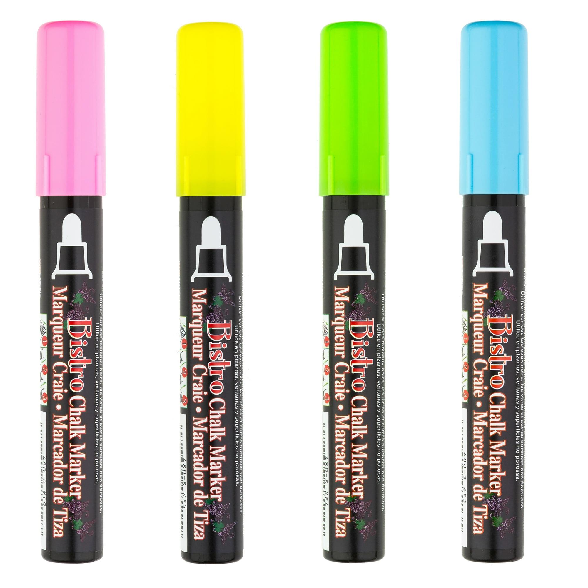Marvy Uchida Bistro Chalk Marker Neon Broad Tip Set. Create fun and colorful chalk art using the Marvy Uchida Bistro Chalk Marker Neon Broad Tip Set. This 4 pc set contains bright colors of, pigmented, water based chalk paint markers that can easily be removed with water and a damp cloth from most non-porous surfaces. Use these pigmented markers on both dark and light surfaces. Great for Seasoned Chalk Boards, Dry Erase Boards, White Boards, Light boards, Metal, Mirrors , Glass Plastic and most non porous surfaces