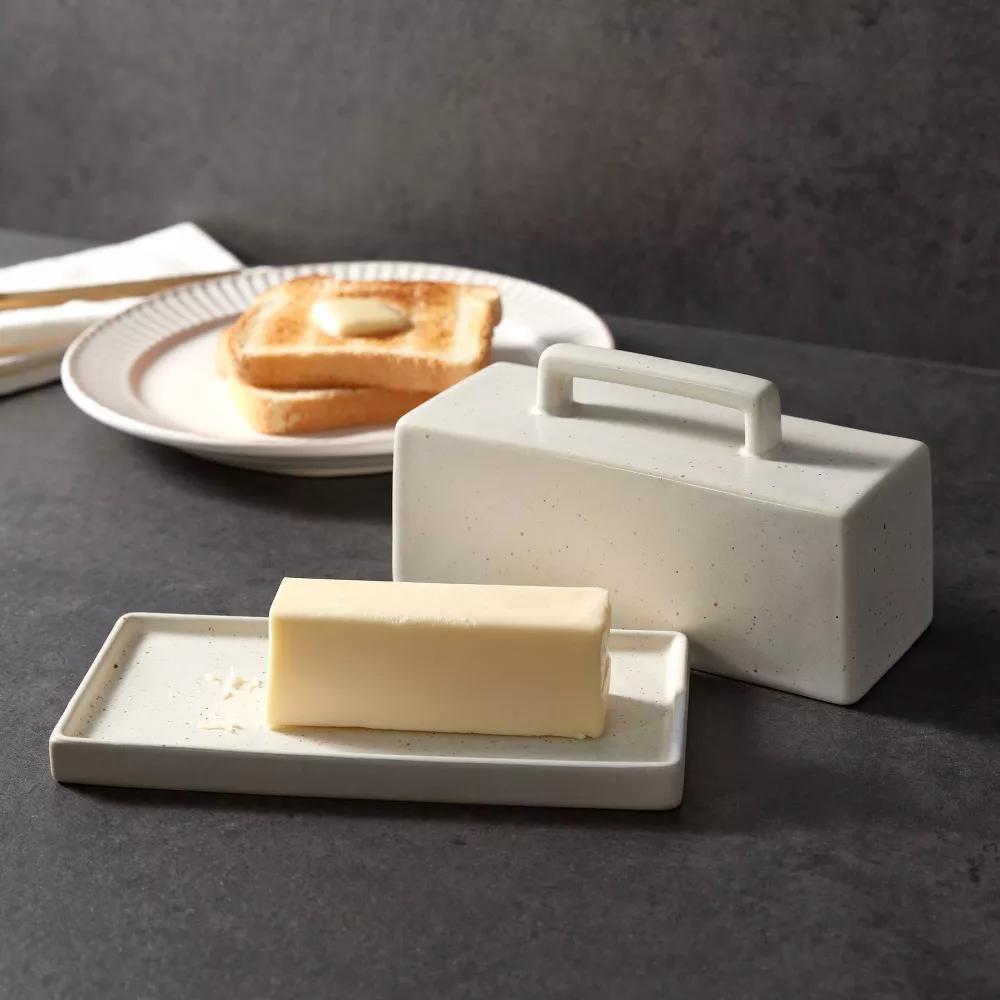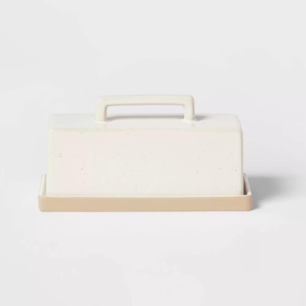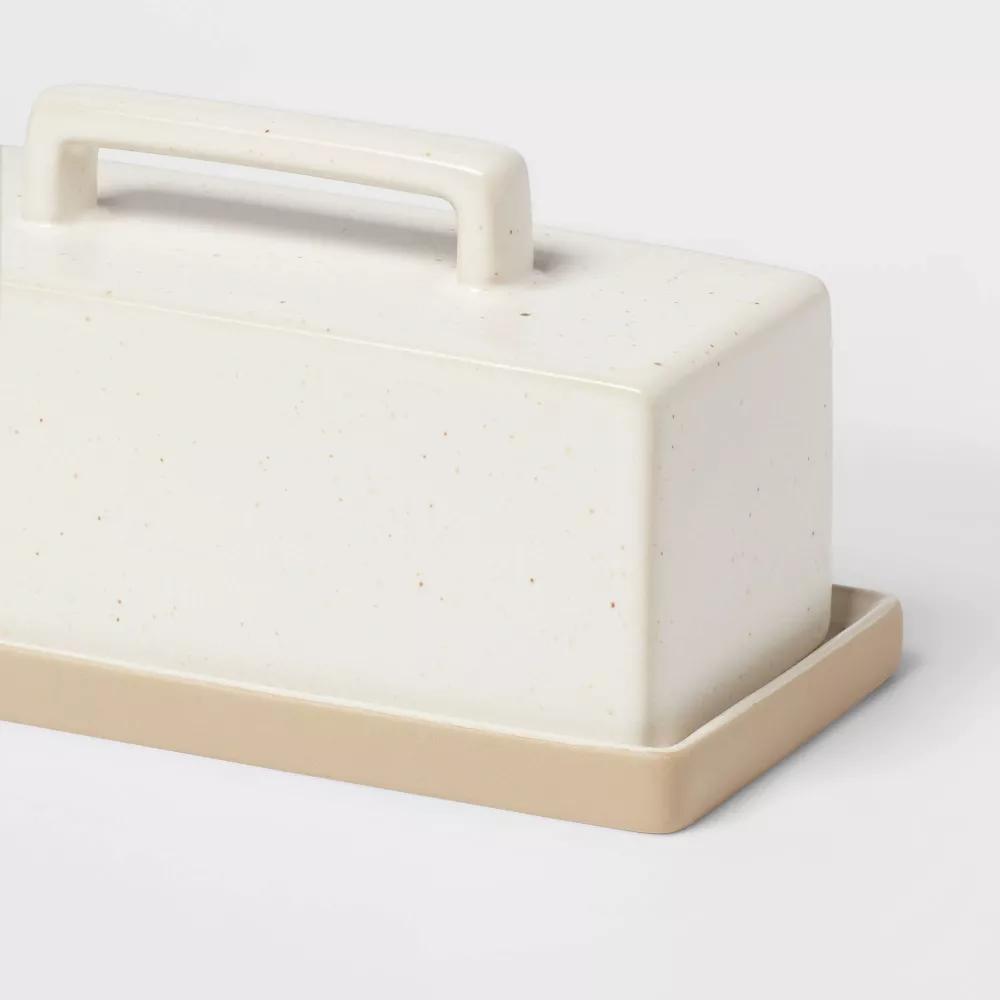 Stylishly and conveniently serve butter at the table with this Camwood Collection Stoneware Butter Dish from Threshold™. This butter dish is designed with a rectangular silhouette and features a speckled cream-colored top and a neutral-shade base for a two-tone look.