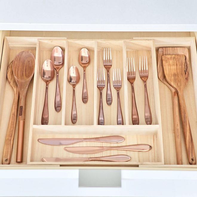 Circularity meets organization with the iDesign Renewable Paulownia Wood Expandable Flatware and Cutlery Tray. This responsibly designed tray features divided compartments in various sizes to provide storage in kitchen and pantry drawers for flatware, cutlery, utensils, measuring cups and spoons and more. This innovative flatware tray expands from 12" to 22" to reveal additional storage and to provide a perfect fit in any size drawer. The open-top design ensures items are always visible and accessible, while the built-in dividers keep items in place when opening and closing the drawer.