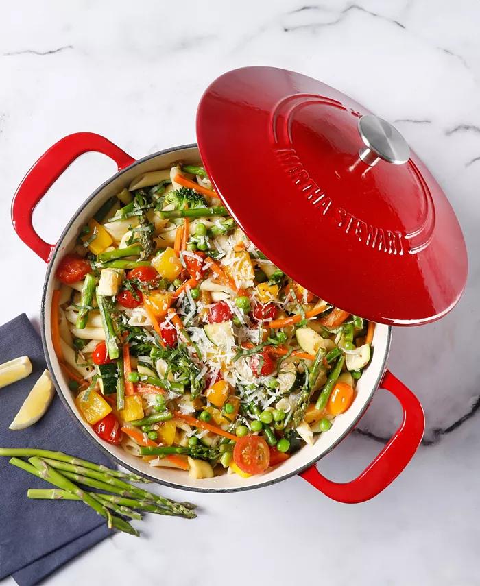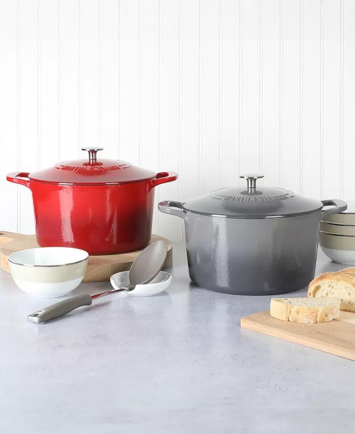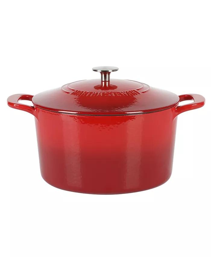 Martha Stewart Collection Gatwick enameled cast iron Dutch oven with lid, 7 quart, with knob, wide handles. The Martha Stewart Collection Gatwick 7 quart enameled cast iron Dutch oven with lid provides versatility and durability while making all kinds of delicious recipes every day. Crafted from durable cast iron, this piece distributes and retains heat evenly to slow cook stews, braise meats, bake casseroles and more.