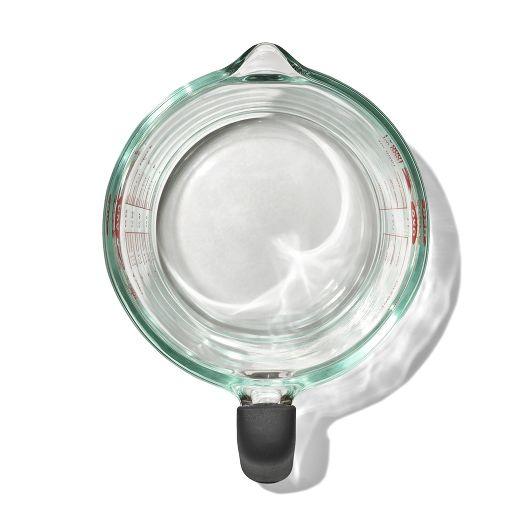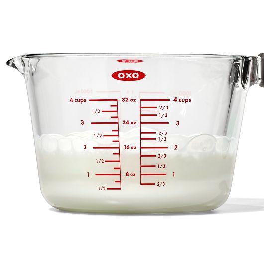 We’ve made measuring, pouring, storing, heating and reheating liquids even easier with the OXO Good Grips 4-Cup Glass Measuring Cup. Not only does it feature our bold, easy to read standard and metric measurement markings, the Cup is made of thermal shock resistant Borosilicate glass so you can take the Cup from the fridge or freezer straight to the oven or microwave without fear of it shattering.