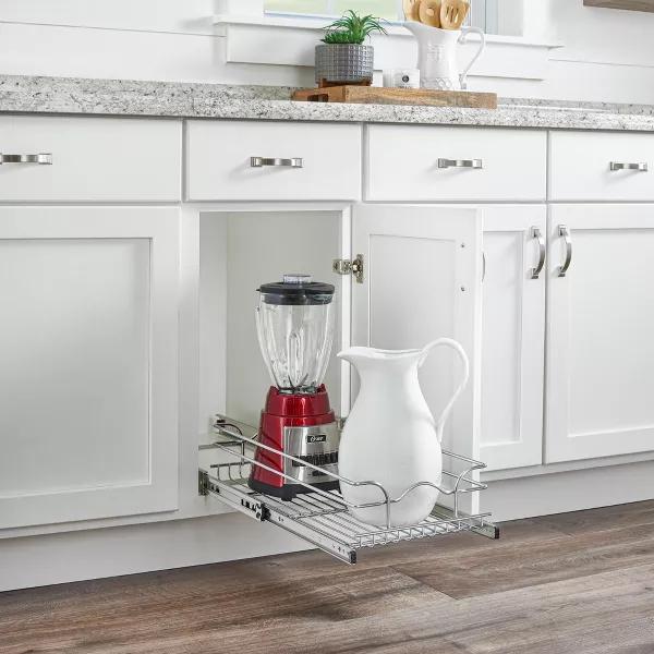 Easily access pots, pans, lids, stand mixers, and other kitchen accessories with the Rev-A-Shelf Kitchen Cabinet Pull Out Wire Basket. This wire pull out basket installs on the bottom of your kitchen cabinet.