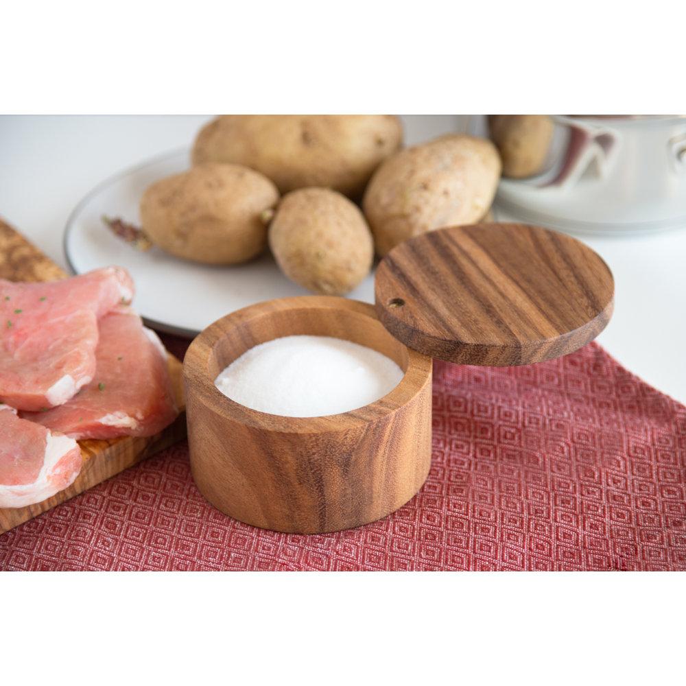 Add a charming means of storage to your kitchen. Our Salt Cellar is made from gorgeous acacia hardwood, making it functional and beautiful due to its rich, shimmering colors. This piece is perfect for keeping sea or kosher salts, spices, and more at easy access.