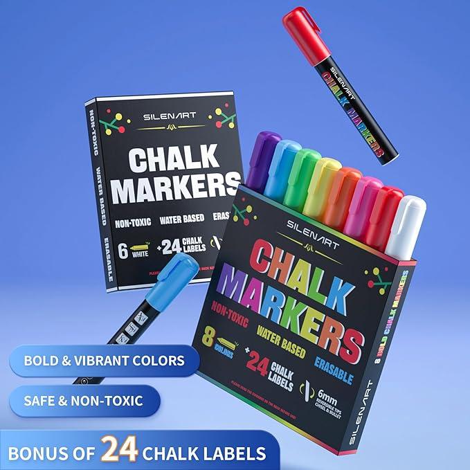 SILENART Chalk Markers - 8 Color, 24 Labels, Reversible Tips