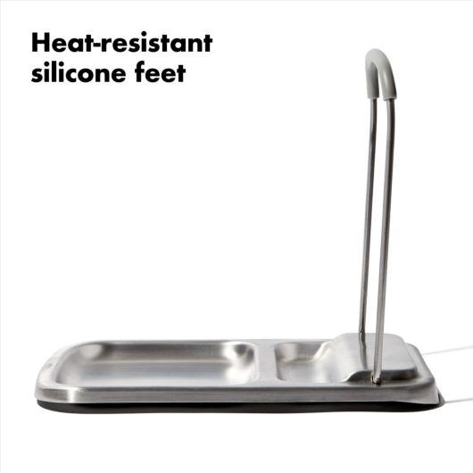 Keep countertops and stovetops neat with the OXO Good Grips Stainless Steel Spoon Rest with Lid Holder. The two-in-one design includes a generously sized base that holds multiple or oversized utensils and a wire Lid Holder that keeps condensation and drippings off surfaces for easy cleanup.
