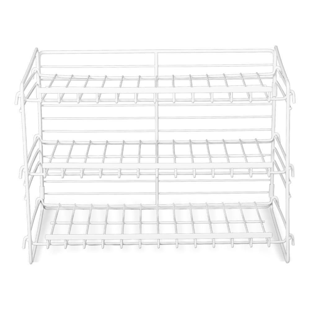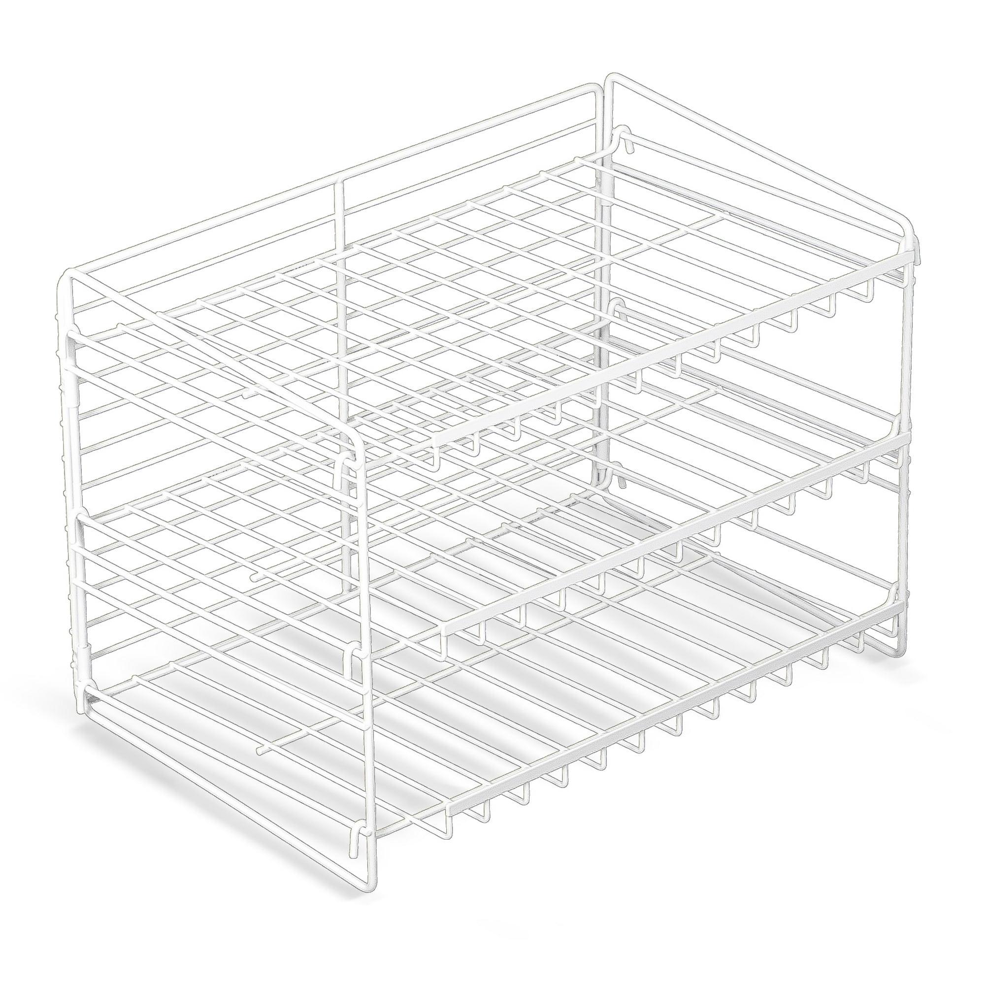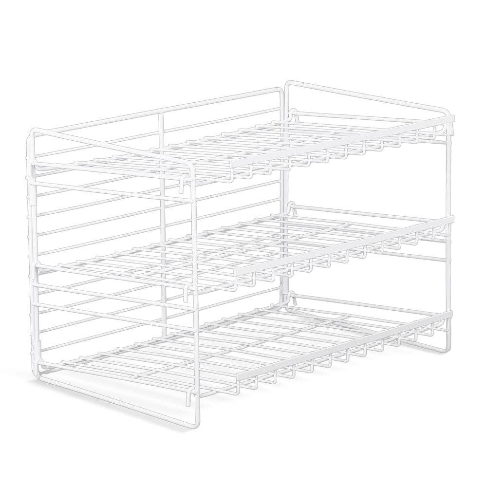 Keep all of your canned foods organized and maximize your cabinet space with the help of a Mainstays 3 Tier Can Organizer. This can rack features a simple yet functional design and pairs well with most any kitchen decor, making it a practical choice. A Mainstays can organizer can hold up to 27 standard size 15.25 oz cans. It has a stacked shelf design that makes use of the vertical space in cupboards, allowing users to store even more, making it a good space saving solution for pantries both large and small. The gravity flow design of the can storage organizer allows users to see each label clearly, eliminating the need to dig or shuffle through canned goods. This rack is designed to automatically roll the cans forward when one is removed and the shelves may be adjusted to fit larger size cans. The Mainstays 3 Tier Can Organizer can organizer features a sturdy steel construction for long lasting use and is a nice addition to kitchen pantries and countertops.