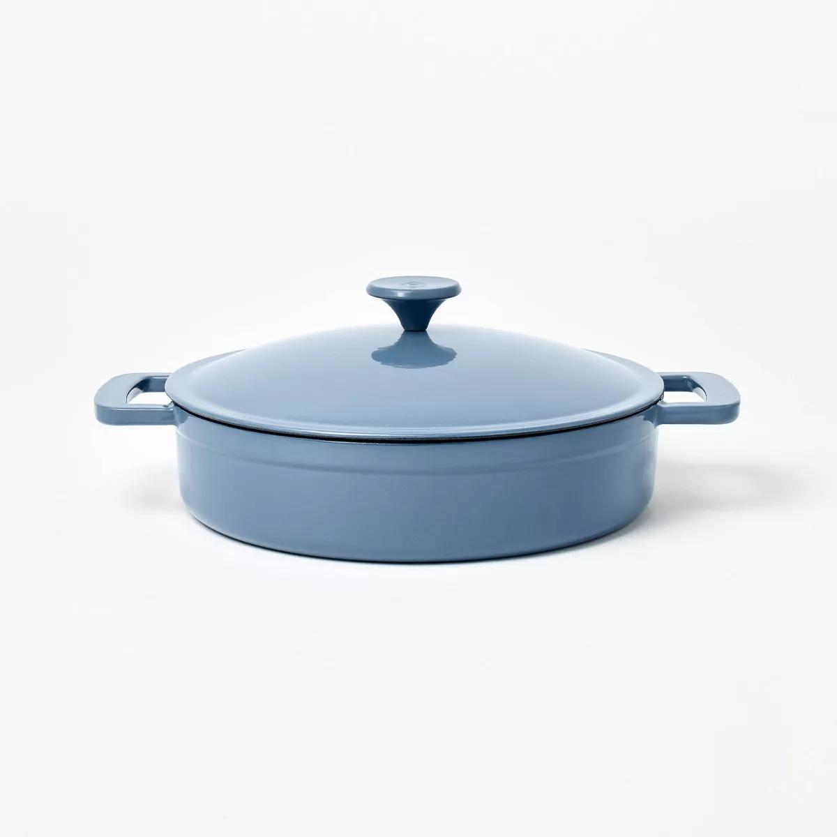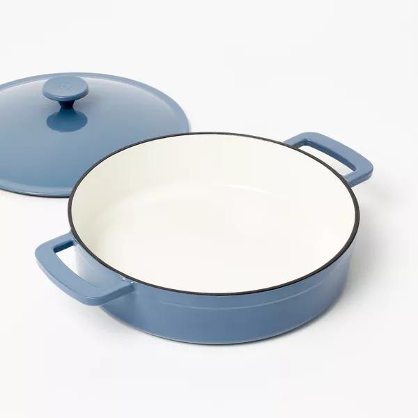 Elevate your cookware with the functional, modern style of the 3.5-Quart Enamel Braiser from Figmint™. Made from cast iron with an enamel finish, this braiser features extended handles for lifting after cooking, making it easier to transport dishes from kitchen to tabletop for serving.