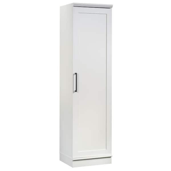 Looking for a solution to help organize your clutter and chaos? We've got just what you need. Find a place for all your things without having to sacrifice on sleek design with this storage cabinet from the HomePlus collection. Behind the large door of this kitchen storage cabinet is a hidden storage area that includes 3 adjustable shelves and 1 fixed shelf for customizable storage options. The shelves of this 1 door storage cabinet are ideal for a variety of different things like work binders, pantry items, cleaning supplies, stacks of spare towels and crafting materials. This pantry storage cabinet has room for all your things! The door of this white storage cabinet can be fixed to open from the left or the right side to fit seamlessly into the design of your home. With adjustable levelers to accommodate uneven flooring, this single door storage cabinet makes a great addition to the kitchen, walkway, garage, or your office. Finished in Soft White, this good-looking tall storage cabinet it just what your home is missing.