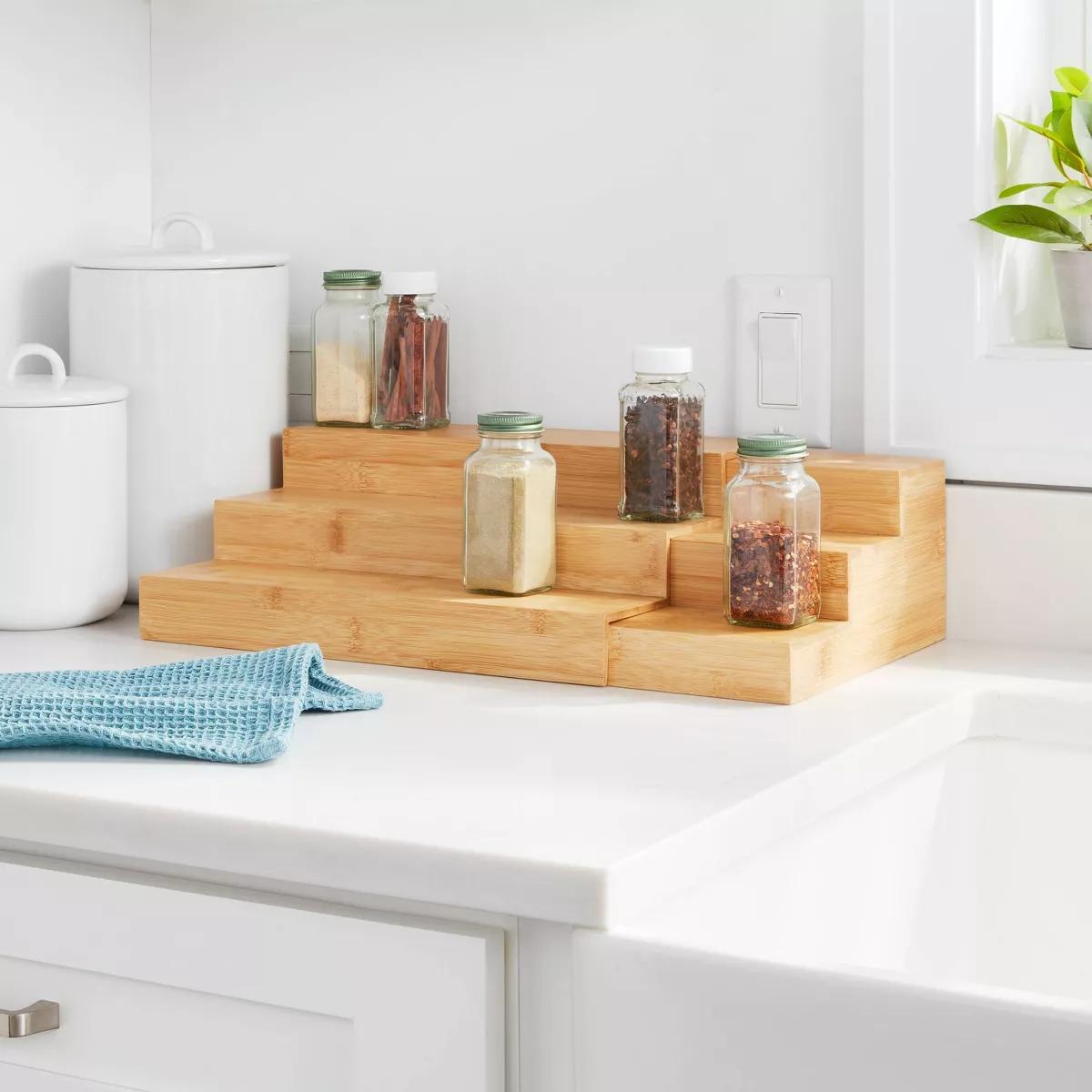 Keep your kitchen rack neatly organized with this Bamboo Expandable Spice Rack from Brightroom™. Made from bamboo, this wooden spice rack features a freestanding and open three-tier design for placing different spices and condiments. Best of all, it features an expandable design that helps you increase its length to add more space. Showcasing a varnished bamboo wood finish, this expandable spice rack brings farmhouse-inspired charm to your kitchen aesthetics.