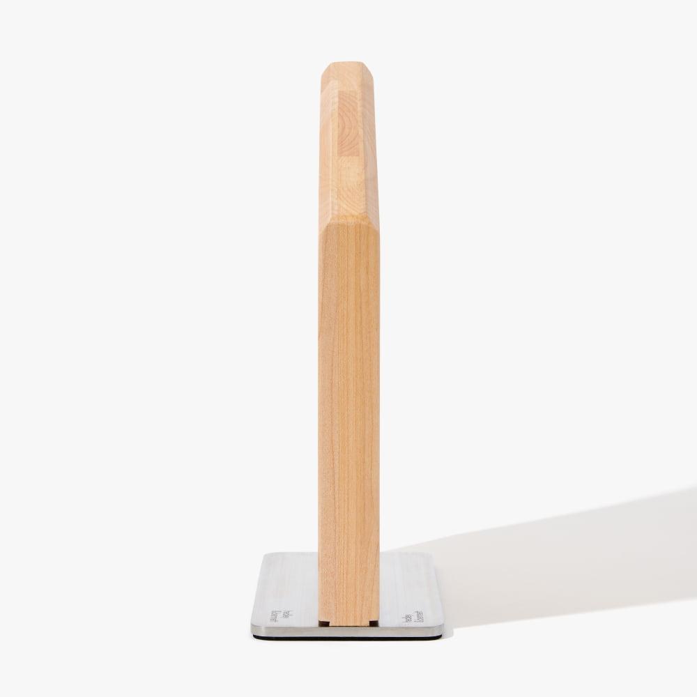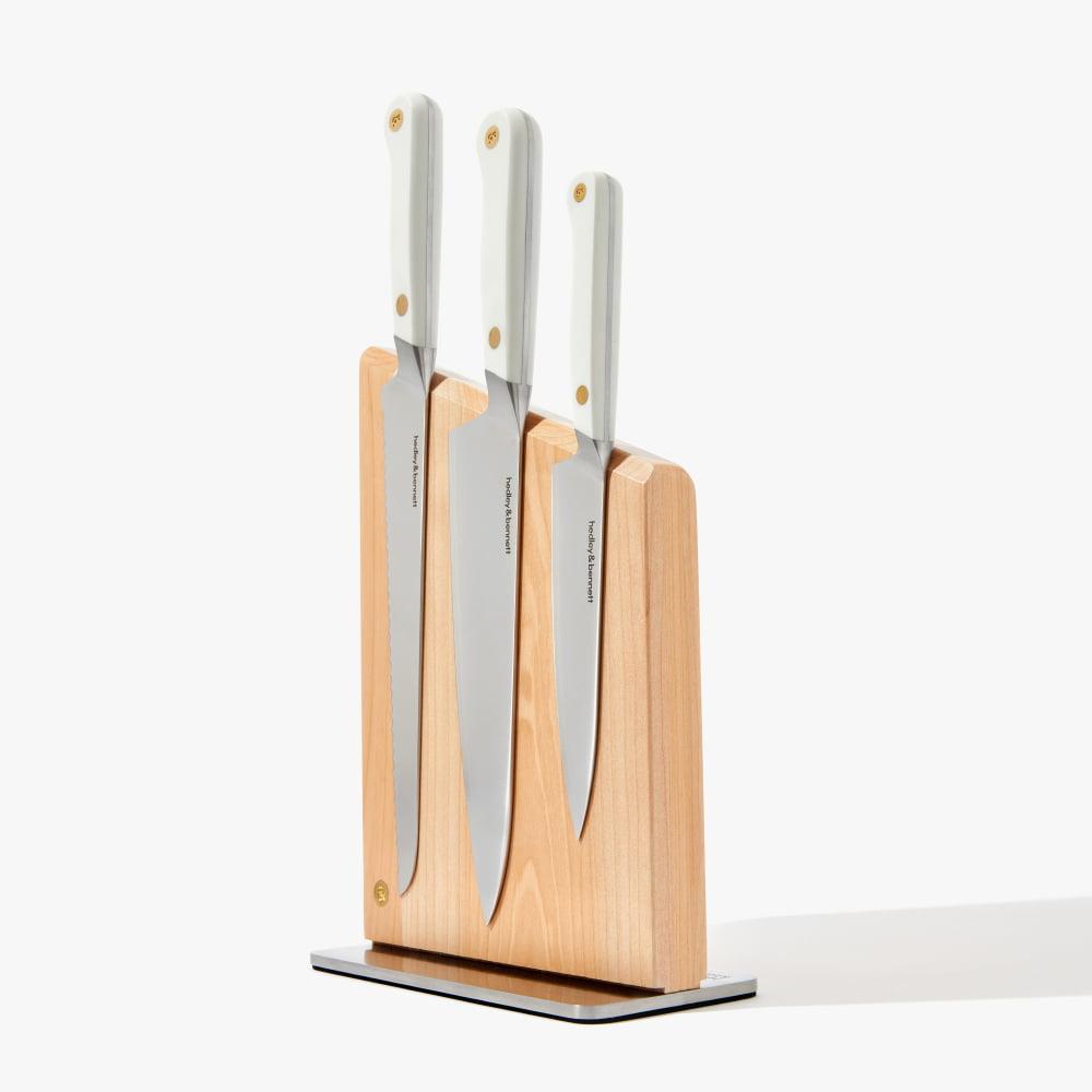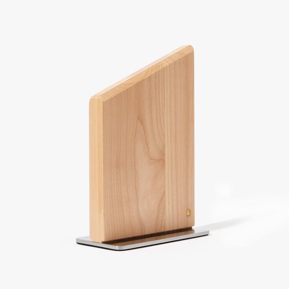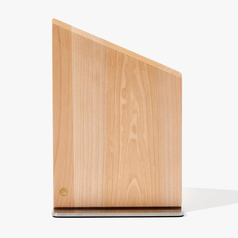 Your knives, at the ready. We designed the H&B Knife Stand to be the perfect home for your knives — beautifully displayed against solid maple, safely held by strong magnets, and slim enough to fit wherever you want them. This magnetic knife stand was created for the modern kitchen, with a small footprint on the kitchen counter and a sleek, elevated design. Both sides of the knife stand are magnetic, so you can store up to 6-8 knives where they're easy to grab whenever you need them.