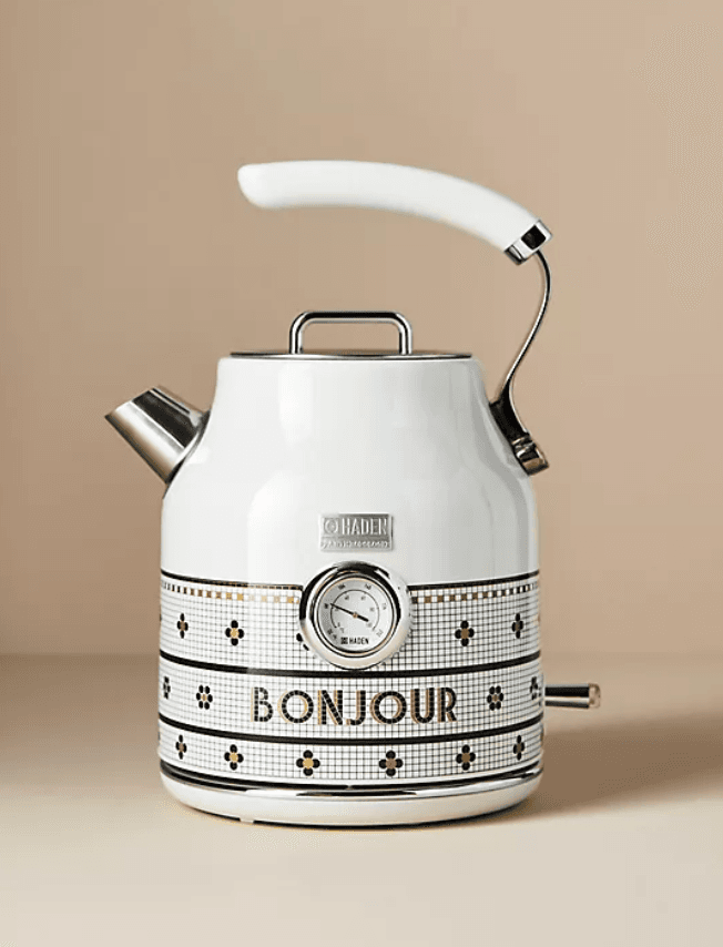 Designed in collaboration with Anthropologie, this limited-edition kettle features the signature Bistro Tile design, decaled on Haden's iconic British kettle silhouette. Perfect for morning cups of hot tea or pour-over coffee, it accommodates seven cups of water, lights up when water is boiling, and features auto shut-off for safety.