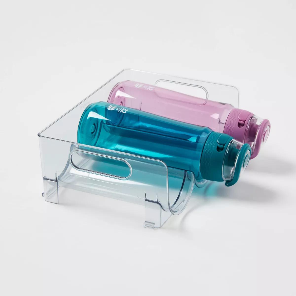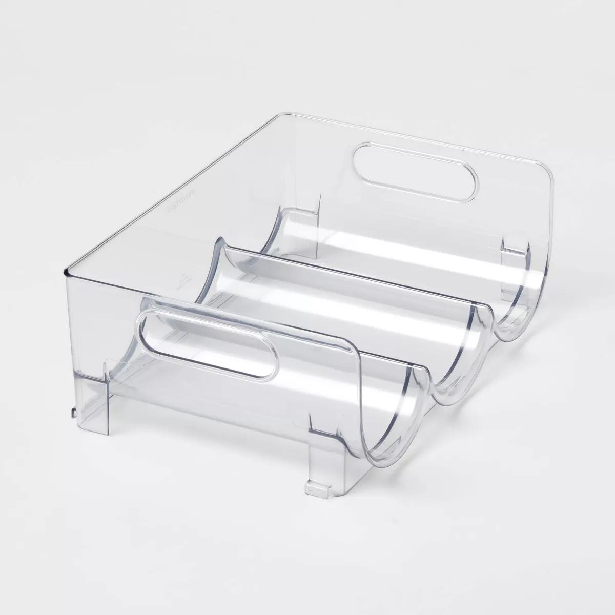 Keep your collection of bottles organized in one spot with the Plastic Hydration Bottle Storage from Brightroom™. This clear bottle storage is made with plastic and holds multiple bottles. Designed with side cutout handles for easy movement from one place to another, this plastic bottle storage also offers convenient storage with its stackable design.
