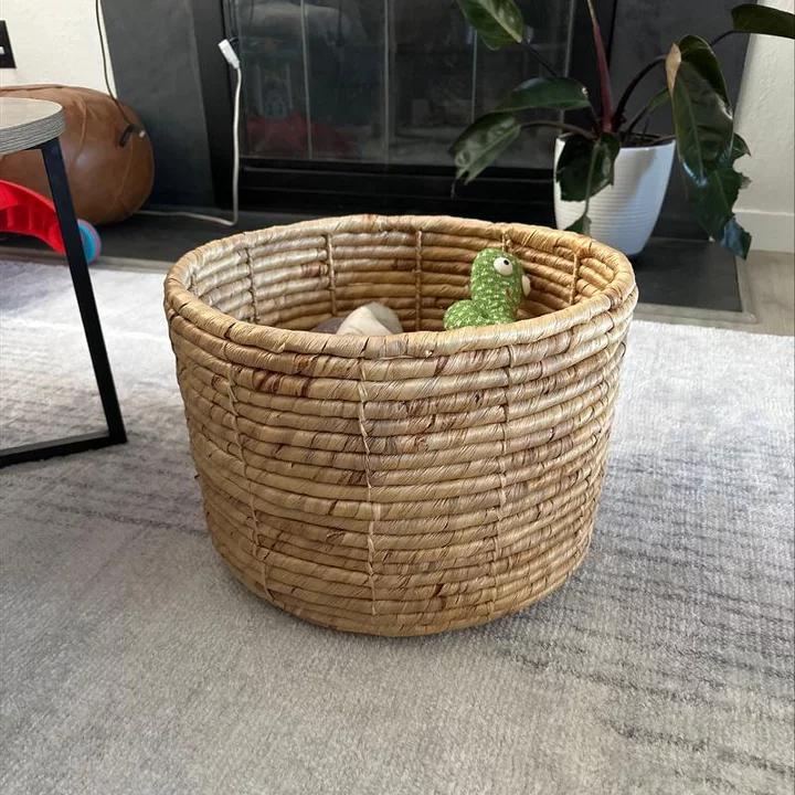 This small round basket can be used for storage or as a decorative accent. It features coiled water hyacinth construction for a natural textured look that's easy to pair with other decor. Great for holding household items, it can be air dried for easy care.