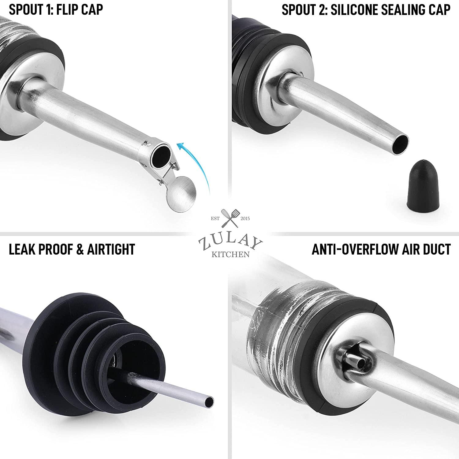 COMPLETE OLIVE OIL DISPENSER SET - Control how much oil you pour onto the pan or your meal with this oil dispenser set. It comes with one glass bottle, 2 pouring spouts (1 with flap lid and 1 with dust cap), 1 funnel, 2 pieces black cap, and 2 pieces airtight sealing corks.