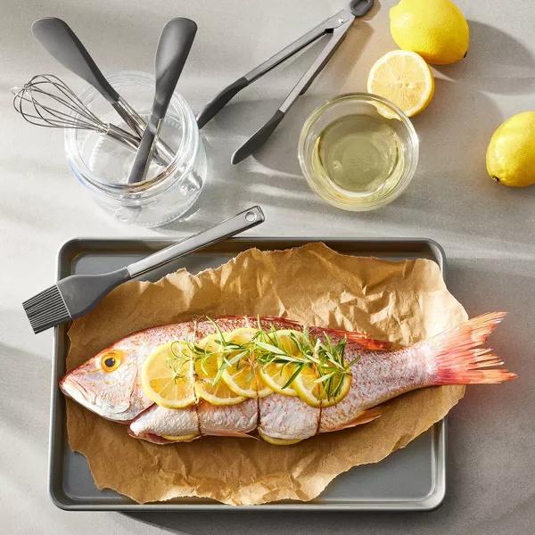 Handle a variety of cooking and baking tasks like a pro with this 5-Piece Stainless Steel/Silicone Mini Kitchen Utensil Set from Figmint™. This mini utensil set includes a spatula, jar scraper, basting brush, whisk and tongs, all designed with ergonomic silver-finish stainless steel handles. All of the pieces except the whisk feature dark gray silicone heads that are safe to use on all cooking surfaces, and the utensils resist heat up to 450 degrees — plus, they're also dishwasher safe for easy cleanup.
