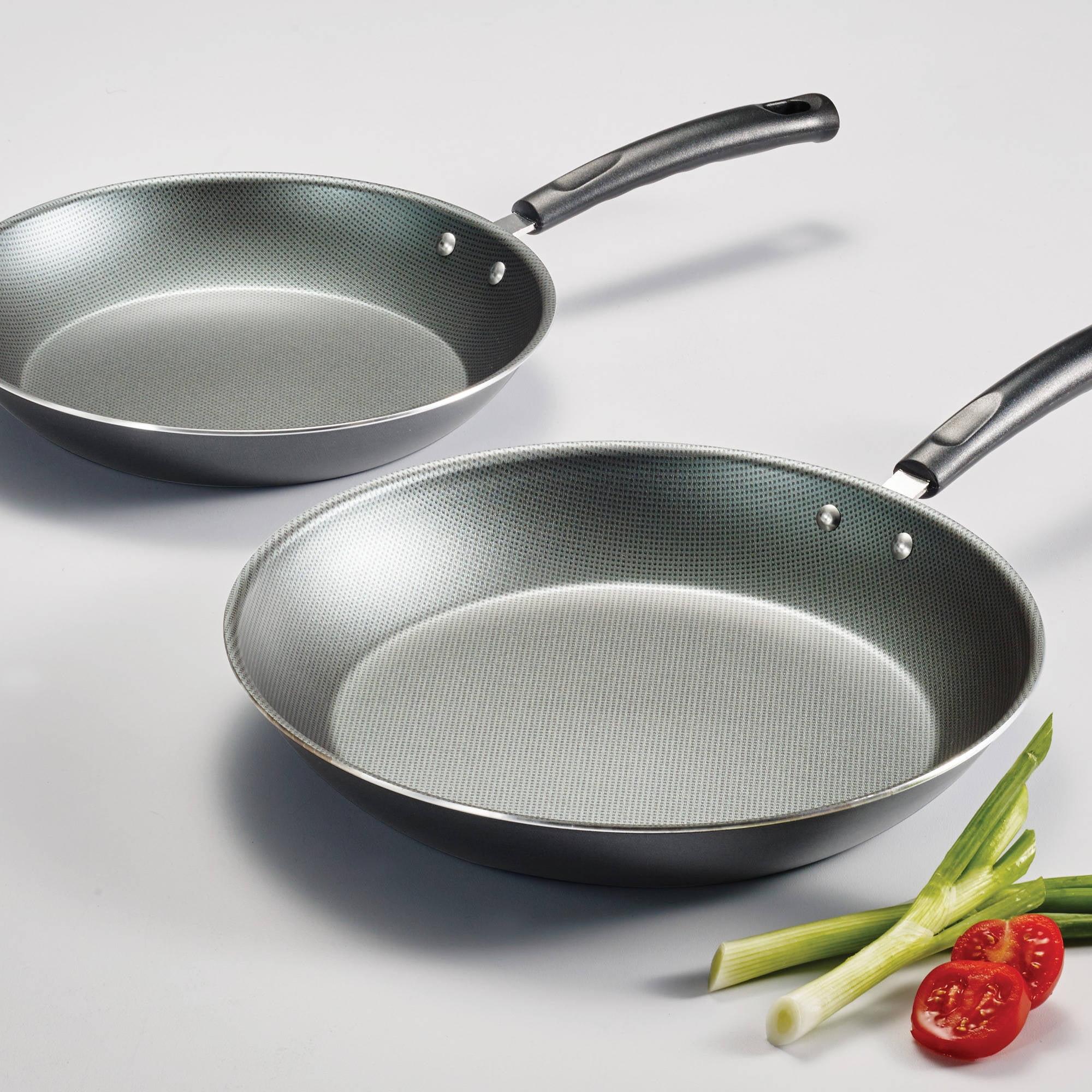Tramontina's PrimaWare 2-Piece Steel Gray Nonstick Saute Pan Set contains handy sizes of 9.5-inch and 11-inch Saute Pans, which are useful for most everyday cooking tasks. The patterned interior nonstick coating ensures easy cooking and simple cleanup. The different size saute pans are perfect for preparing several flavorful dishes from omelettes and countless other breakfast foods to vegetables and several dinner entrees. These dishwasher safe saute pans make prepping dishes a breeze. These aluminum saute pans are lightweight and can be used by any level meal preparation person. Riveted, stay-cool handle decreases the chance of burning yourself when you are preparing dishes. This steel gray nonstick saute pan set will complement numerous kitchen decors.