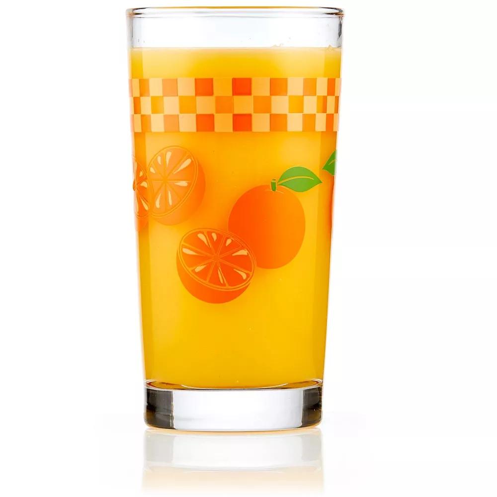 Heavy base juice glasses with assorted colorful fruit designs and gingham border.Use for everyday beverages like water and juice, or to serve up tea and lemonade to guests.Includes 4, 11-ounce juice glasses.Durable and dishwasher safe, but handwashing preferred.Securely packaged in shipping box; always wash prior to use as orders fulfilled by Libbey are shipped directly from manufacturer's warehouse