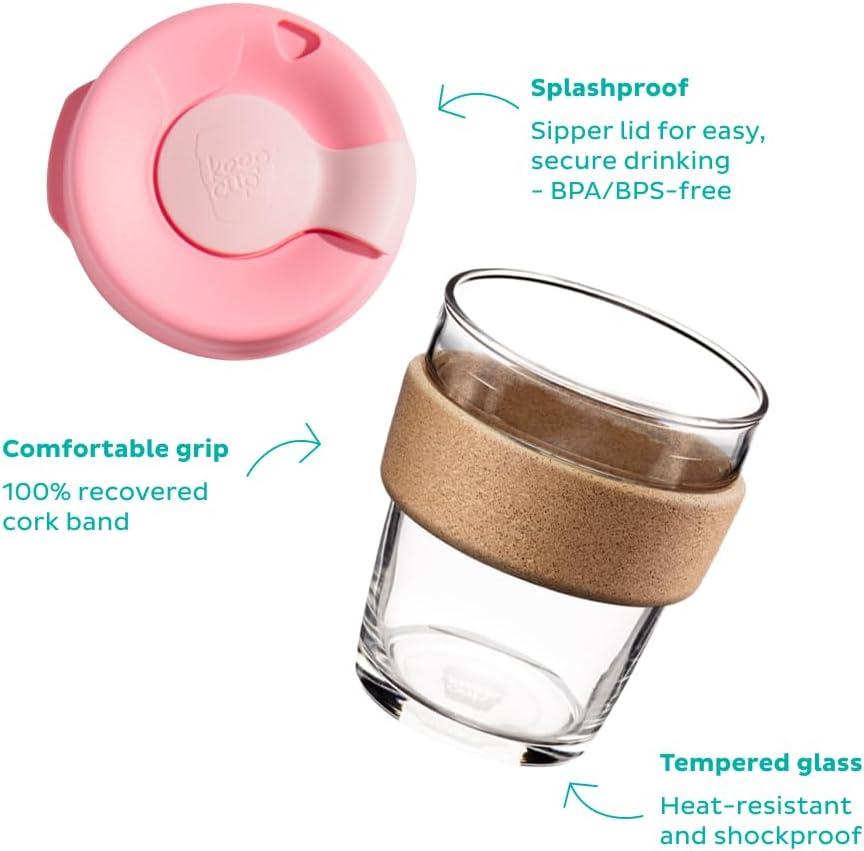 The original iconic barista standard glass reusable coffee cup. Just 24 uses and you are having a positive impact when compared to single-use cups. Splashproof press fit Lid. Drinking pleasure, lid on or off. 100% recovered material cork band for heat retention and organic feel. Barista standard design ensures a consistent and enjoyable coffee experience at home or your favorite café. Made to last, BPS/BPA-free, tempered glass and recovered cork built to enjoy your daily adventures.