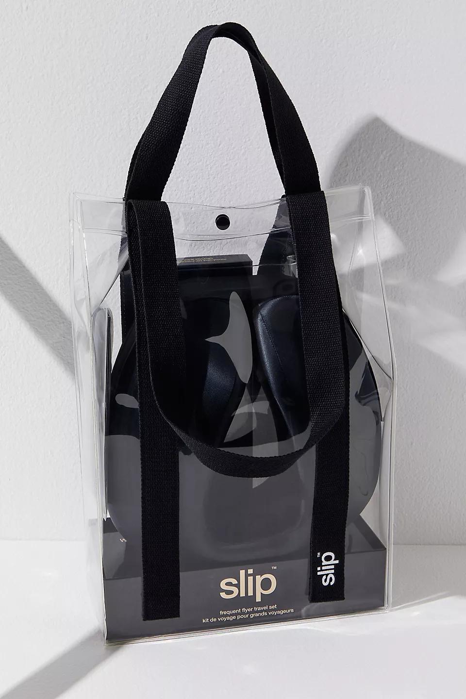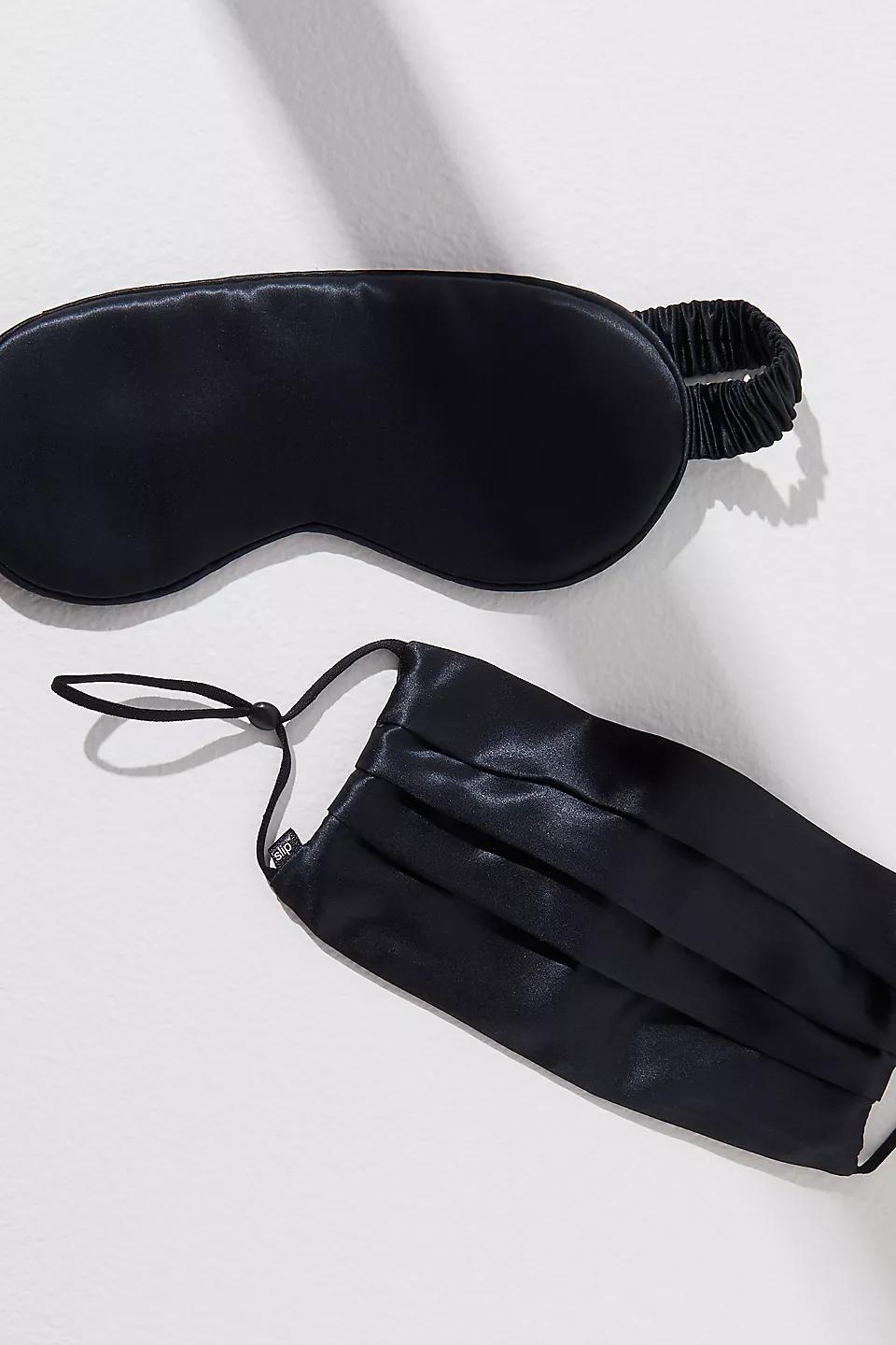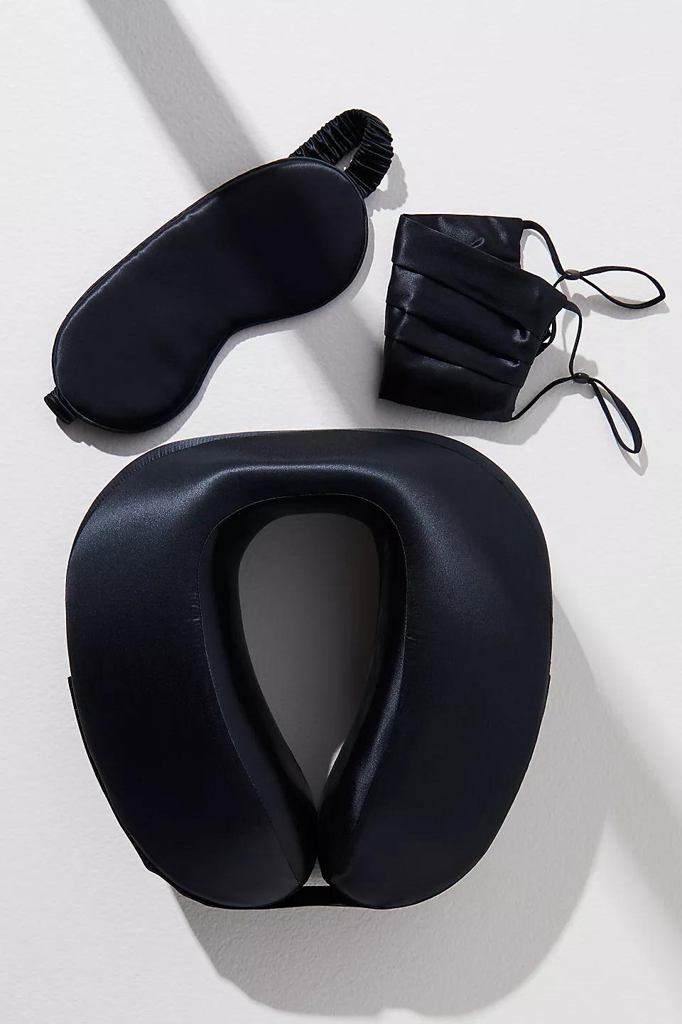 Your new favorite travel companion, this luxe set from Slip features an ergonomic neck pillow, eye mask, and face mask in their signature silk fabrication. Set Includes: 1 x travel pillow with black pure silk removable pillowcase (9.8" x 9.8" x 4.9" / 25cm x 25cm x 12.5cm); Hook and loop fastener made with 100% nylon and filler 100% polyurethane 1 x black pure silk sleep mask (3.3" x 8.1" / 8.5cm x 20.5cm) 1 x black pure silk reusable face covering with cotton inner liner 1 x reusable TPU carry bag made with 100% polyurethane with black handles made with 100% polyester