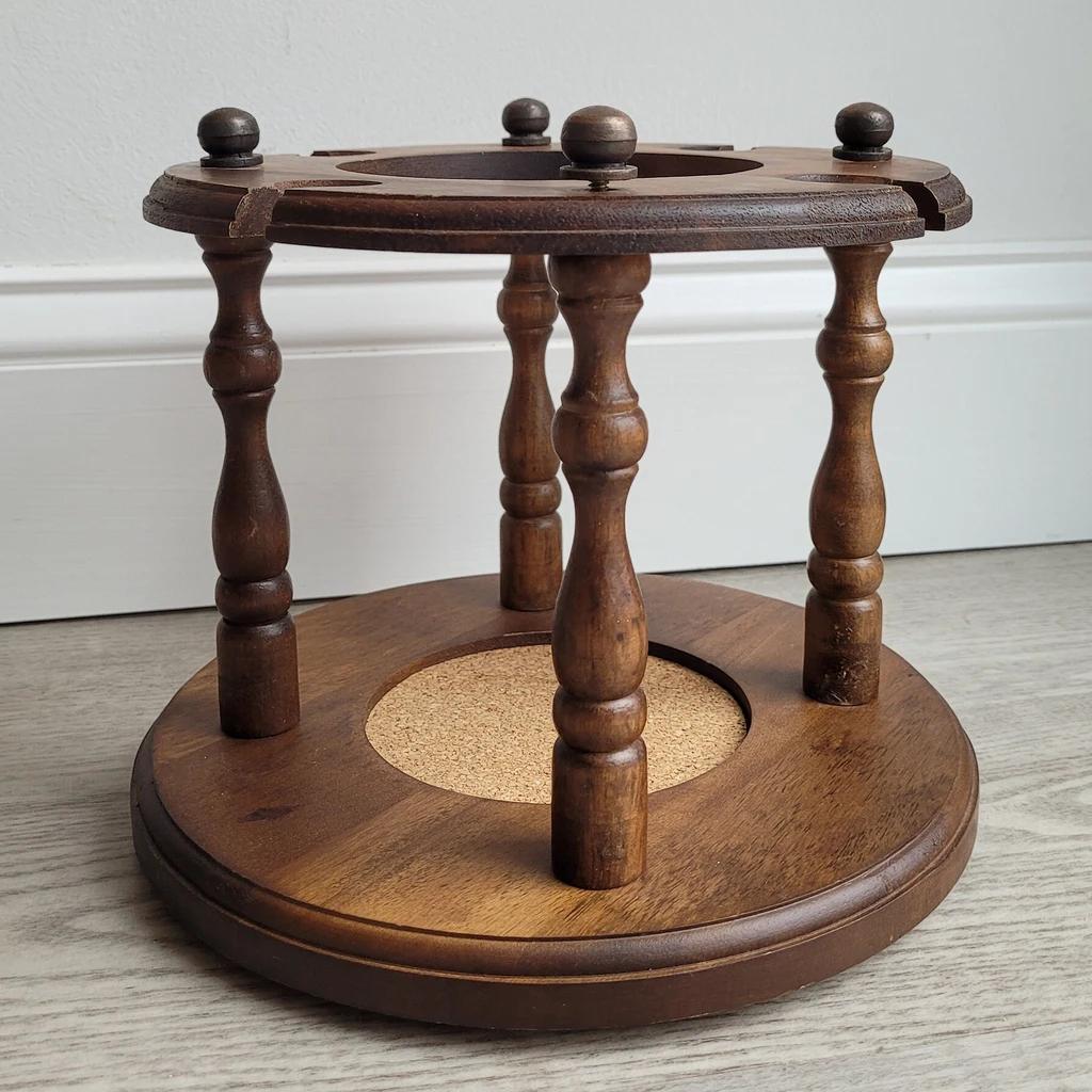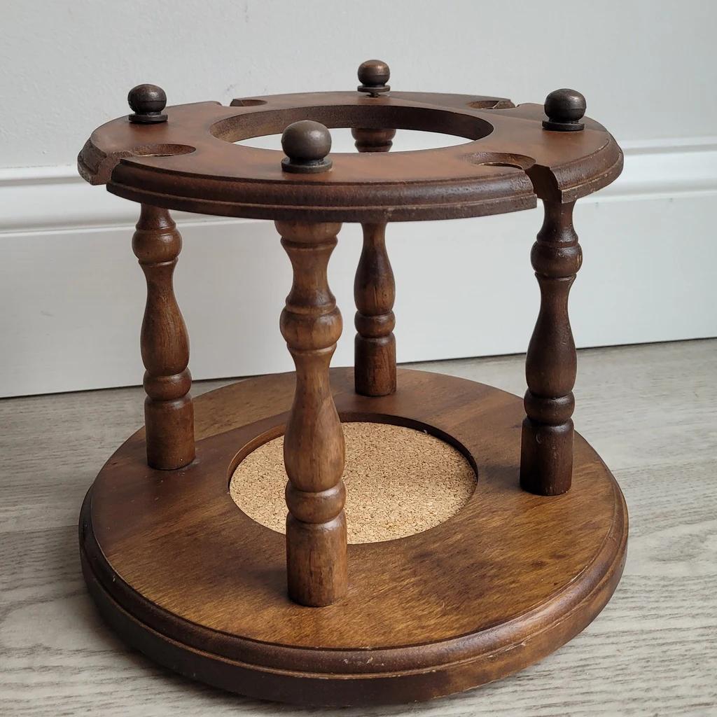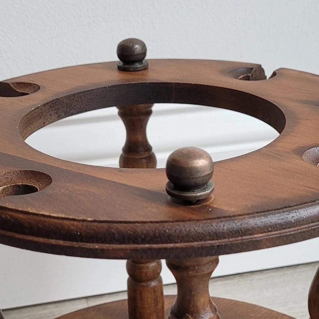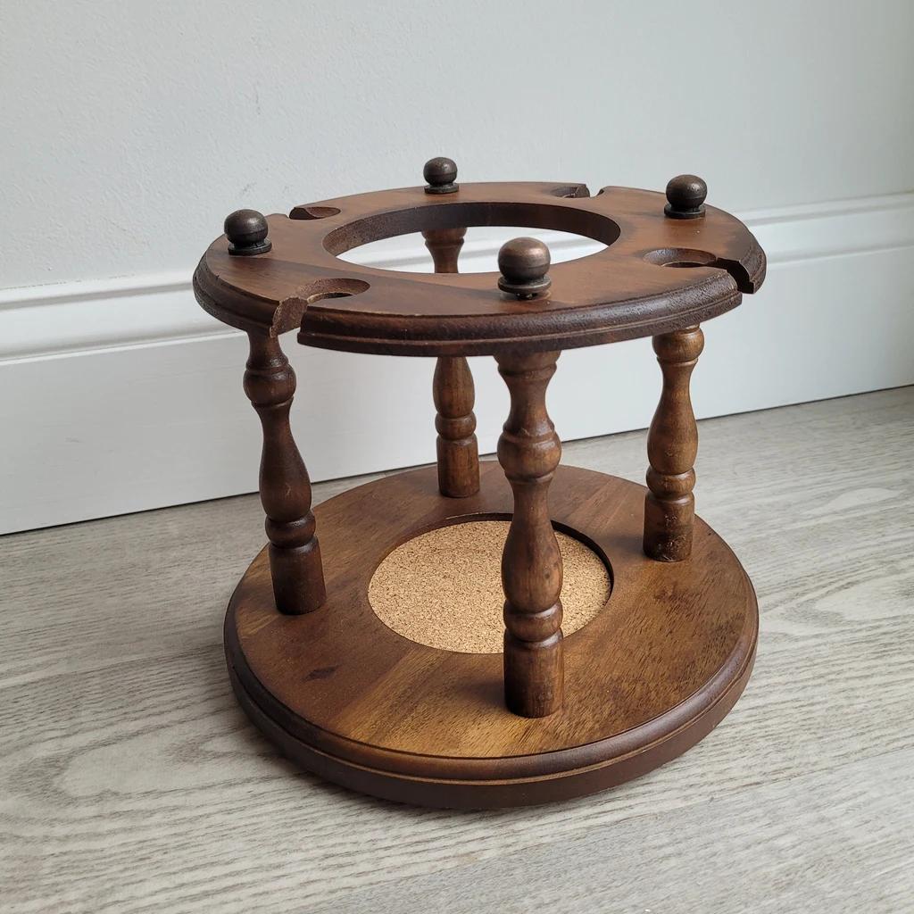 Vintage Round Hi Mark Wine Glass Stand - holds 4 Glasses & Bottle in the middle Excellent condition - looks near perfect Size - 7.75 inches high X 8.5 wide Weighs 1 lb 14 ounces Please see all pictures NOTE-NO GLASSES are included - just the round caddy/display (Shipping combined with multiple purchases & any overage will be refunded minus packing material.) (LocationBR shelf) Smoke free & pet free home. Thanks for looking. Have a nice day. Vintage Wine Glass Stands Wood Stand For Wine Bottle & 4 Glasses Bar Display Servers Vintage Glass Holders Caddy