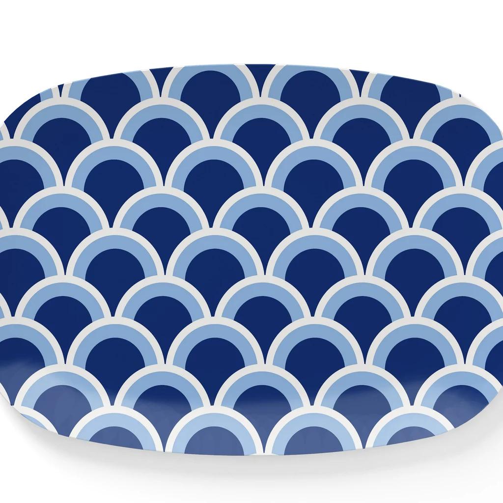 Our Thermosaf platters can go from microwave or oven, straight to the table. They're melamine & BPA-free, as well as FDA-compliant for food safety. Substantial in weight & durability, these platters feature a high gloss surface that stands up to dishwashing on either rack. 14"x10.25" Production time is approximately 7 business days. Please allow approximately 2 weeks for receipt. HOW TO ORDER If you would like the platter with personalization, please leave us either the monogram or personalized style by number, as well as the monogram or wording ExACTLY as it should appear in the optional personalization area. Don't forget to include a frame number. For 3-letter monograms, the last name is in the middle. To see our monogram choices, click on the arrow on the main photo. The color on your screen may differ from your final piece. Blue Art Deco Thermosaf Platter