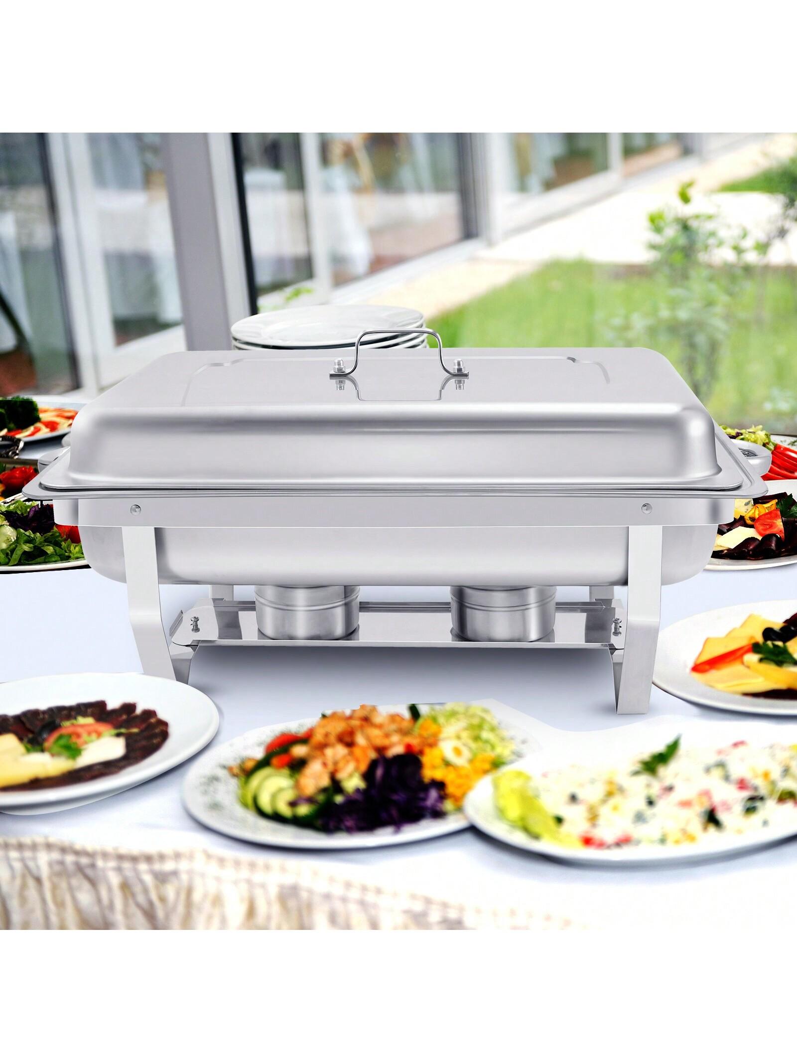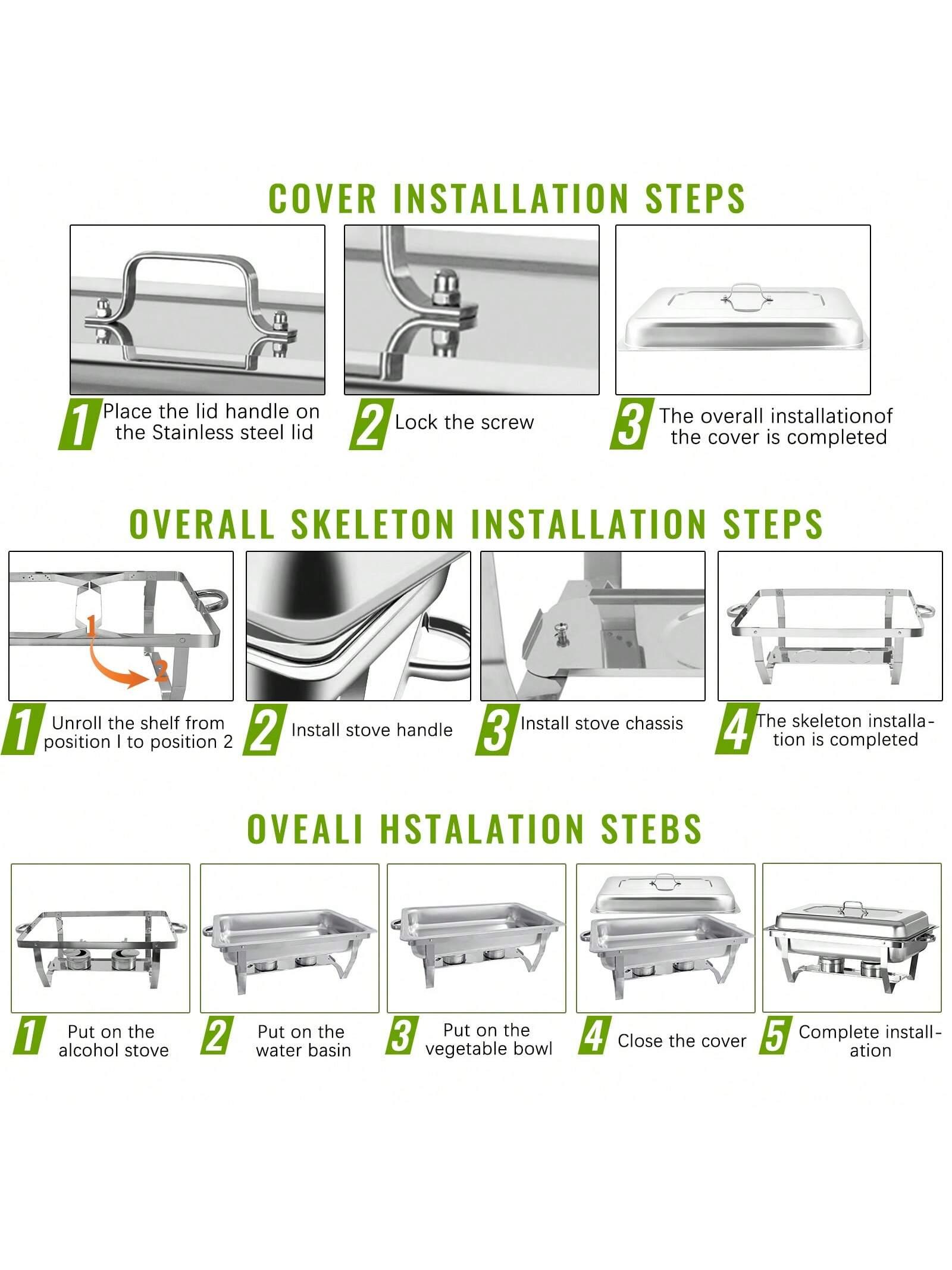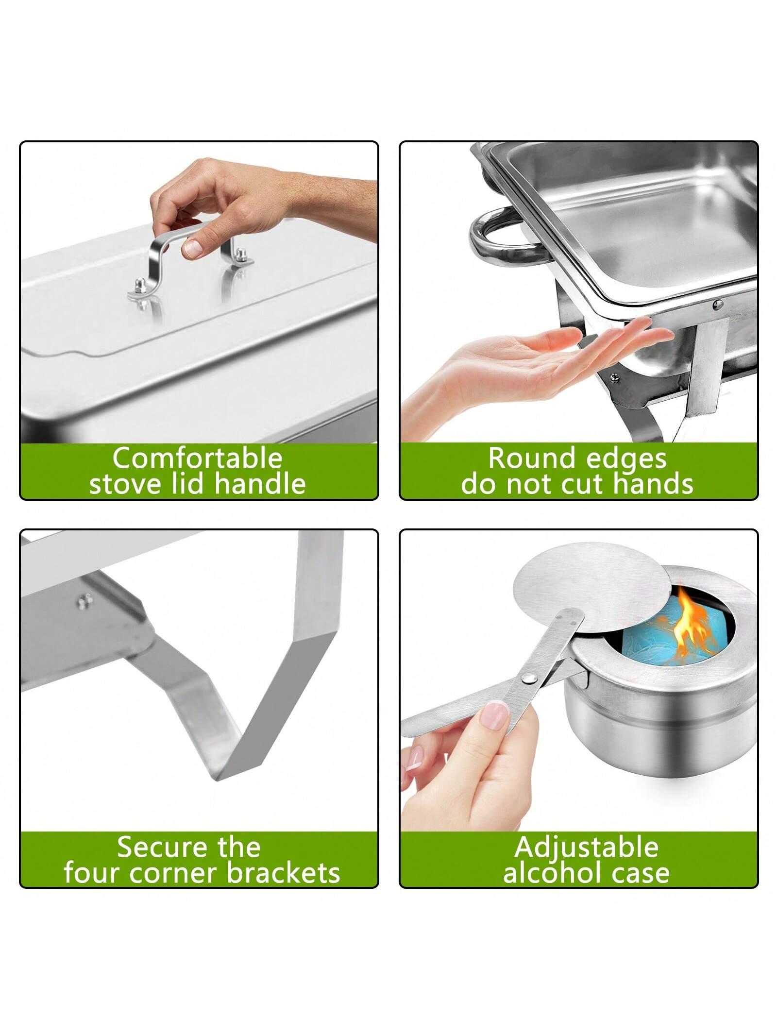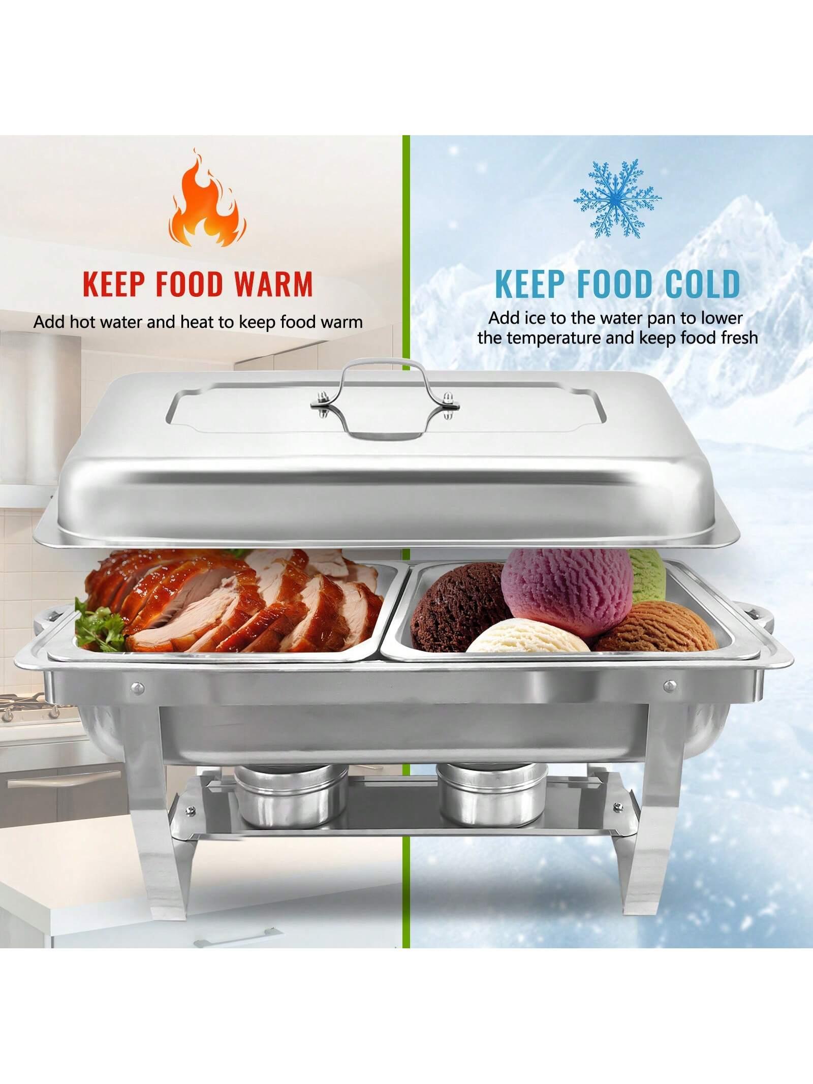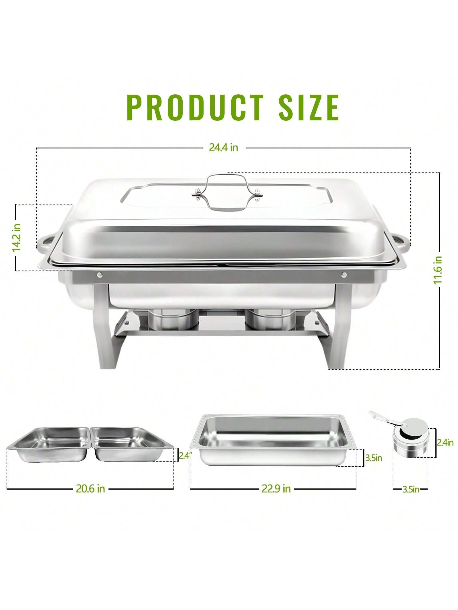 [Chafing Dish Buffet Set]The buffet warmer for parties set contains lids, food pans, water pan, foldable frame, fuel holer, fuel bottom tray. Each catering food warmers also contains fuel burners and folding frames, providing a comfortable dining experience.[Reliable Material]The chafing dish buffet set is made of stainless steel material with high polished surface, corrosion and rust resistance and easy to clean, the chafing dish set has a thickened gold plated handle on the outside to keep your guests from being scalded.[Easy to Use]The buffet warmers are foldable and easy to assemble and store, the chafing dishes for buffet have smooth edges to ensure no harm to your hands, the lids and water trays are equipped with handles for easy gripping and moving, and the frame is designed with hooks that can be applied to keep the top open when eating.[Keep Food Warm or Cold]Each buffet chafer is equipped with fuel burners on the bottom, you can continuously heat the food with fuel to maintain the appropriate temperature of the food and ensure the taste of the food; You can add hot water to the water tray to keep food warm, or add ice cubes to the water dish to cool food, keeping food fresh and delicious.[Widely Application]The party food warmer is ideal for various parties, such as Thanksgiving, Halloween, Christmas, Easter, banquets, weddings, birthday parties, family dinners, Memorial Day, BBQs, holiday meals, school or company events, which keeps food warm for a long time and the included bottom tray minimizes flame exposure to ensure the safety of your guests.Rectangular 8QT Chafing Dish Buffet Set Full Pan Food Warmer for Parties BuffetsSPECIFICATIONMaterial: Stainless SteelVolume: 9 L /8 QuartFood Pan Capacity: 8QTWater Pan Capacity: 13QTSingle Pack Weight: 3.75kg/8.3lbOverall Size: 24 "X14" X11.4"(L x W x H)Dome Cover Size: 20.7"x 12.9"x 3.8" (L x W x H)Food Pan Size: 20.6"x 12.6"x 2.56" (L x W x H)Water Pan Size: 21.9"x 13.8"x 3.5" (L x W x H)2 Fuel Holders Size: 3.54" x 2.5"(Diameter x Height)Package Includes:(5 Pack)5 x Water pan;5 x Food pan;5 x Cover;5 x Frame Stand;10 x Fuel Holders with Covers;Rectangular Half Pan Chafing Dish SpecificationThe chafing dish has handles to ensure that the product can be moved with ease.Material: Stainless SteelColour: SilverVolume: 9 L (8 qt.) ea.Food Pan Dimensions: 12.6'' x 10.2''Water Dish Dimensions: 21.6'' x 13.8''x 3.2''Fuel Holder Dimensions: 3.7'' x2.2''Overall Dimensions: 21.7'' x 13.4'' x 11''PACKAGE INCLUDE(Each Pack)1 x covers2 x food pans1 x water pans1 x folding frames2 x safety fuel holdersRectangular 1/3 Food Pan Chafing Dish SpecificationThe chafing dish has handles to ensure that the product can be moved with ease.Material:Stainless SteelColour: SilverVolume: 9 L (8 qt.) ea.<br/>Food Pan Dimensions: 12.8''x6.9''x1.8''Water Dish Dimensions: 21.7''x14.0''x3.5''Fuel Holder Dimensions: 3.6''x2.0''Overall Dimensions: 21.7''x14.0''x11.8''PACKAGE INCLUDE(Each Pack)1 x covers3 x food pans1 x water pans1 x folding frames2 x safety fuel holders