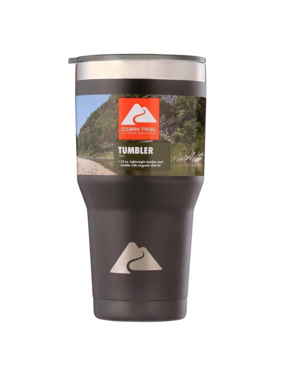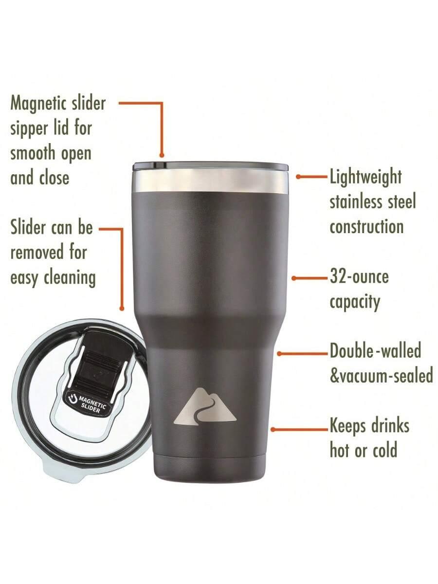 Whether you're on a camping adventure or jumping into your car for your morning commute, you can keep your thirst under control with this durable 32-Ounce Double-Wall, Vacuum-Sealed Tumbler. This 32-ounce travel tumbler is made with high-grade 18/8 stainless steel and is double-walled and vacuum-sealed for maximum temperature control, so it's equally suited to sustaining the temperature of both hot and cold beverages. Whether you like to keep your sweet tea chilled on a hot summer day, or would rather keep your hot coffee from going lukewarm 10 minutes into your commute, this travel cup has you covered. Featuring a durable, rust-proof, and sweat-free design, the Stainless Steel Tumbler is an ideal choice for taking beverages on the go.Adventure is where memories are made, whether it's campouts in the backyard with the kids, Saturdays at the river with friends, or a week in the wilderness alone. helps you and your family create everyday adventures with gear and accessories built with you in mind. From backpacks to tents, they're rugged, dependable, and priced to be practical. Because adventure is not a destination; it's a lifestyle.32 oz Vacuum Insulated Stainless Steel Tumbler, BlackLightweight stainless steel construction32-ounce capacityDouble-walled and vacuum-sealedKeeps drinks hot or coldMagnetic slider sipper for smooth open and closeSlider can be removed for easy cleaningFits in most car cup holders1Stainless Steel