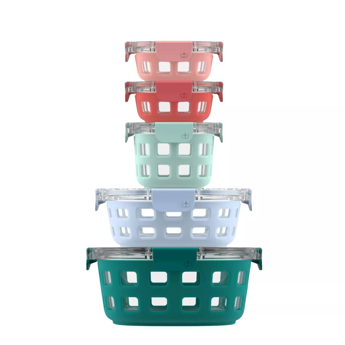 ROUND OUT YOUR LUNCH Equip your kitchen with the Ello Duraglass™ 10pc Round Food Storage Container Set. This set of five glass containers comes with airtight locking lids so you can keep your food fresh for much longer. These containers are leak proof, stain-resistant and oven-safe with the lid off. The containers are protected from chips and breaks by a silicone sleeve. This meal prep set allows you to store food for a feast efficiently and easily.