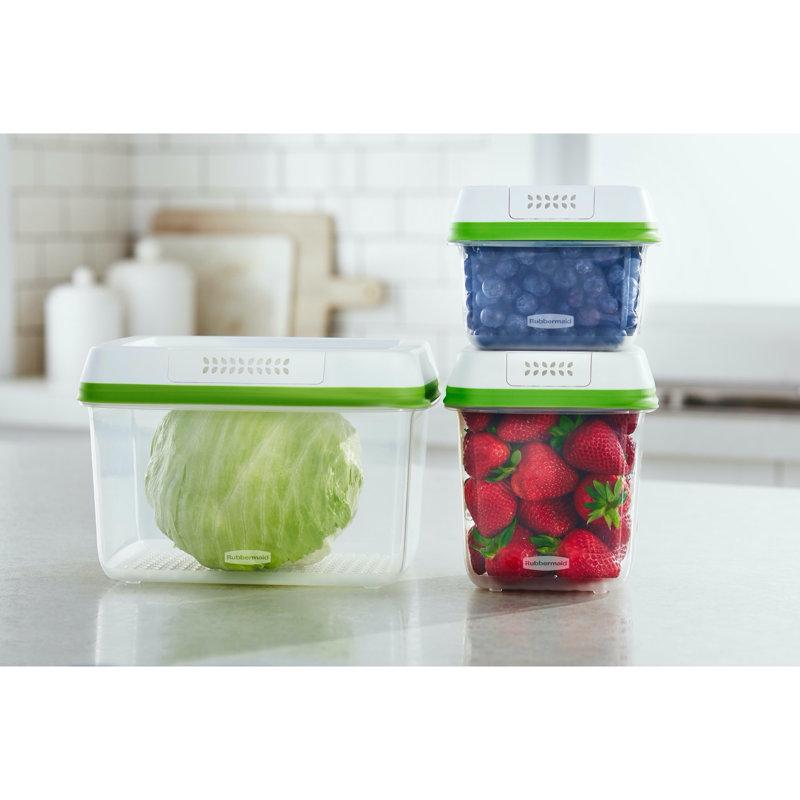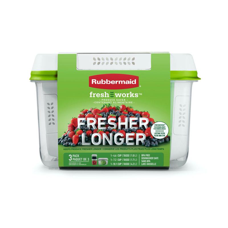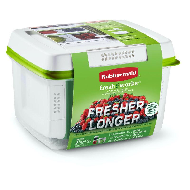 Rubbermaid FreshWorks Produce Saver keeps produce fresher longer. The FreshVent technology filter naturally regulates the flow of oxygen and carbon dioxide to to create the optimal environment for your fresh produce.. The filter lasts the lifetime of the container, with no refills needed. The elevated base lifts produce away from moisture and promotes proper airflow to prevent spoilage. The modular, space-efficient design allows for easy kitchen organization—bases nest inside each other and one lid fits multiple bases to keep cabinets tidy. These plastic containers are BPA-free and dishwasher-safe for easy care.