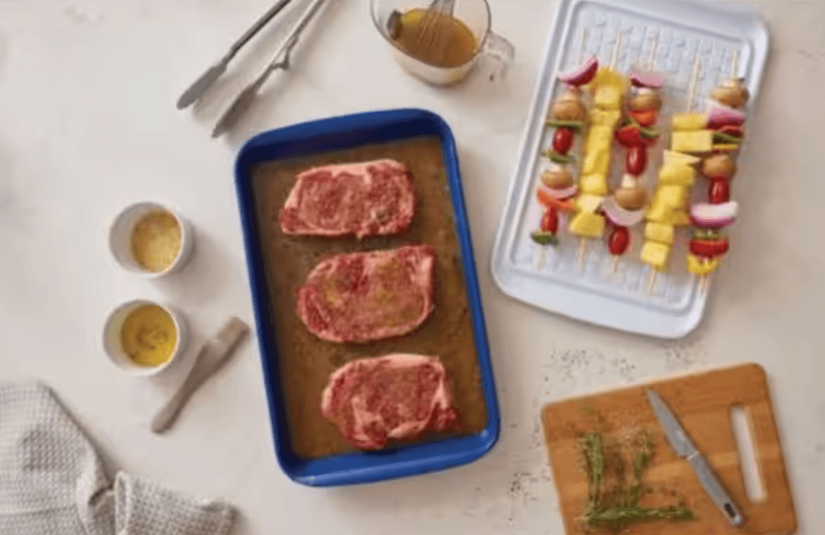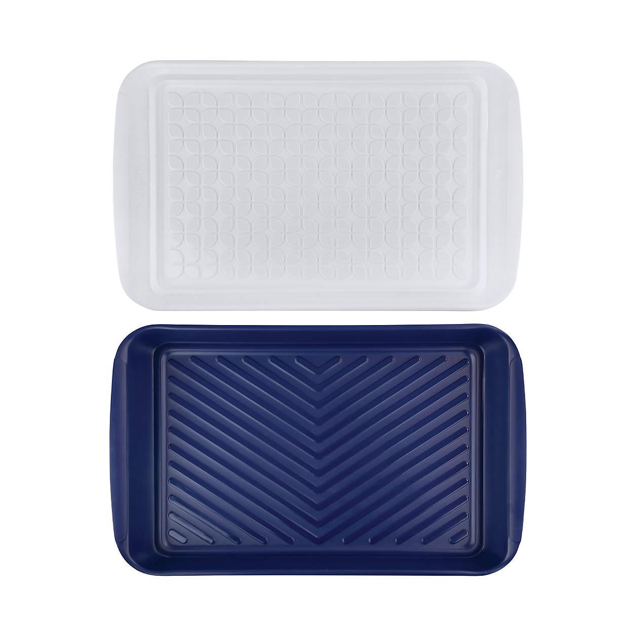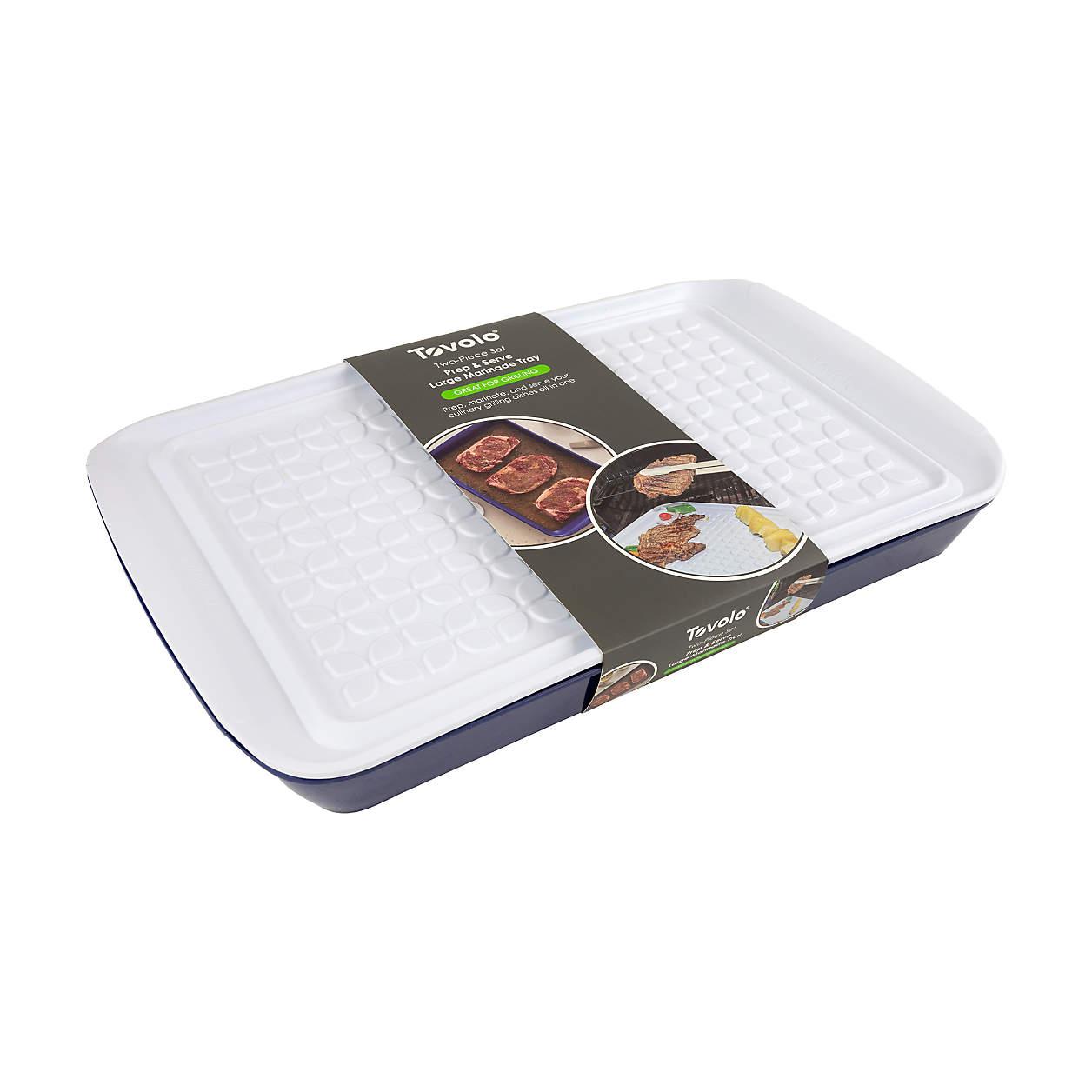 Prep, marinate, and serve your grilling dishes in 1-fell swoop with the 17 in. prep and serve marinade tray set. Featuring a white tray and stratus blue base. Prevents contamination the removable 2-piece tray easily separates to marinate and transport raw meats from cook food to help prevent contamination and foodborne illness. Accommodates a variety of food the large size can safely marinate multiple chicken breasts, steaks, fish filets, shrimp and other seafood, or an array of cut-up veggies.