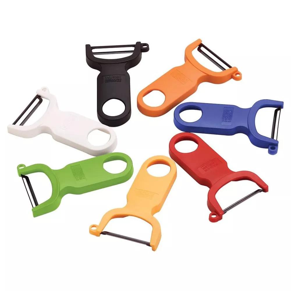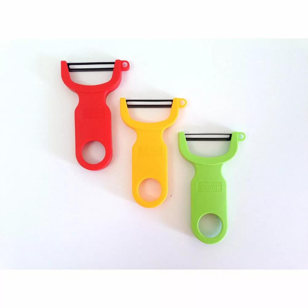 The Kuhn Rikon swiss swivel peeler features a super sharp carbon steel blade that starts sharper and stays sharper. Comfortable, ergonomically designed handle is made from non-slip material to provide ease and comfort for any peeling. The swivel peeler's blade is sharp on both edges so it cuts in two directions. Handy potato-eye remover is on the base of the handle.