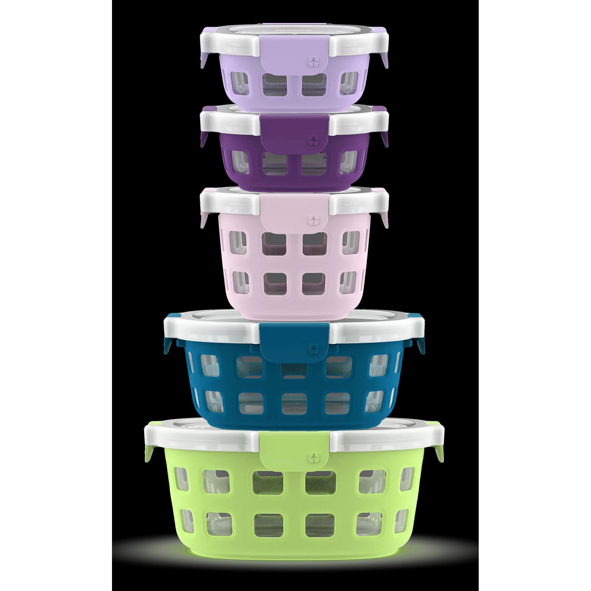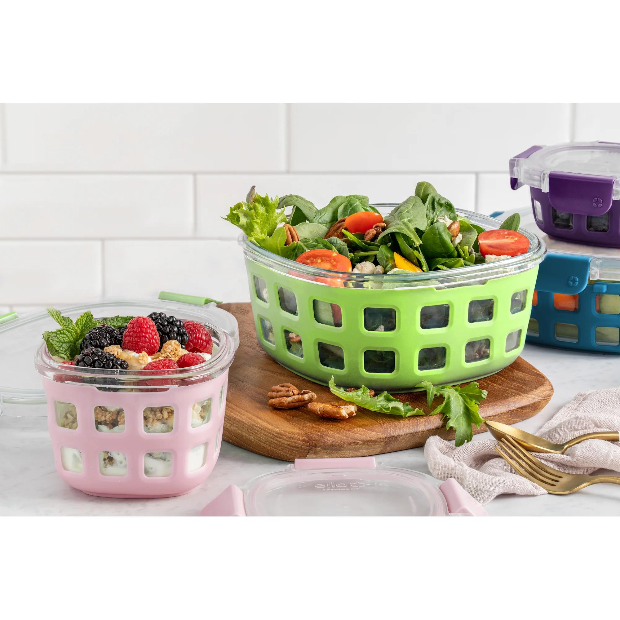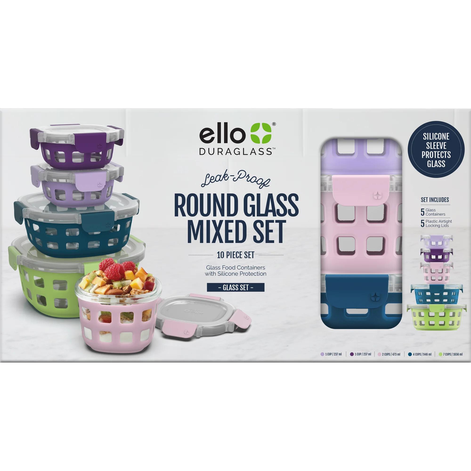 Ello Duraglass Round Glass Meal Prep Set 10 pc set includes (INSERT CONTENTS HERE). This colorful set will add a pop of color to your kitchen and leftovers. Find a size for all your food storage needs whether it's an entry, side or snack