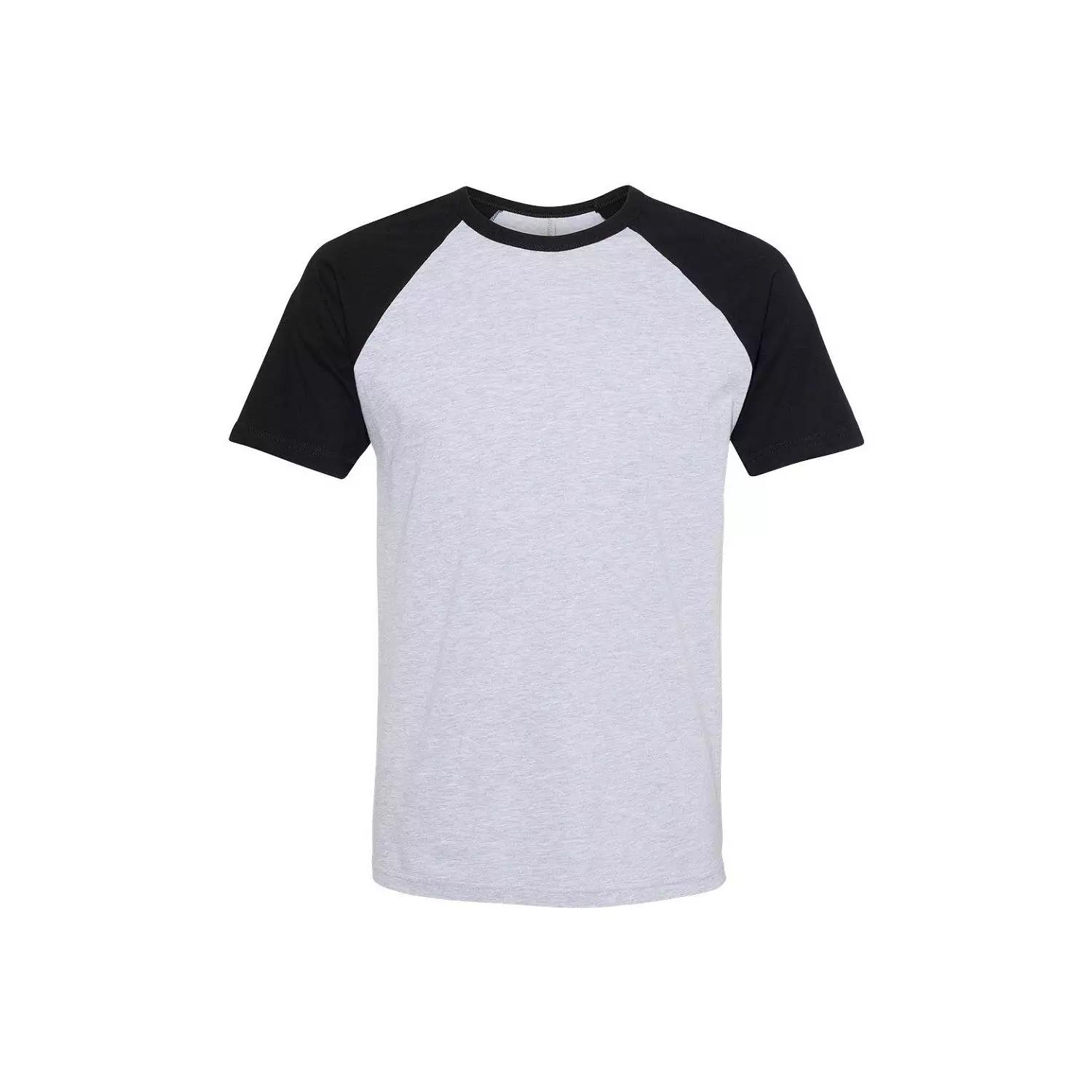 4.3 oz./yd, 100% combed ringspun cotton, 32 singles. Heather Grey is 90/10 cotton/poyester. Fabric laundered . Contrast raglan sleeves and bound neck. Side seamed. Tear away label. Sleeve and neck color listed first, body color listed second.