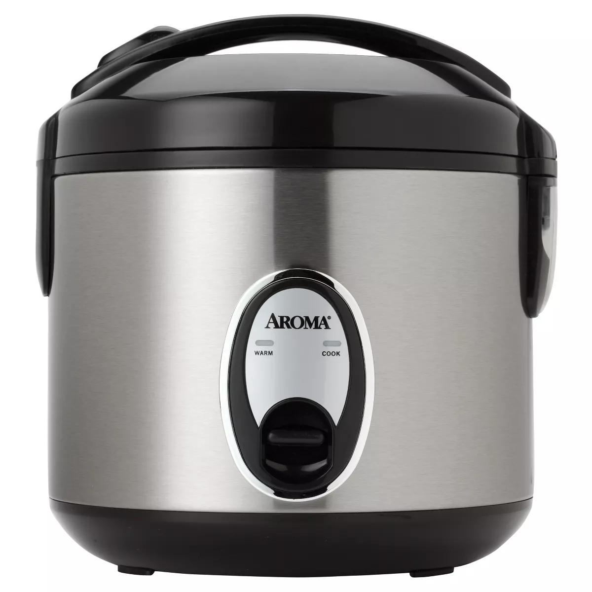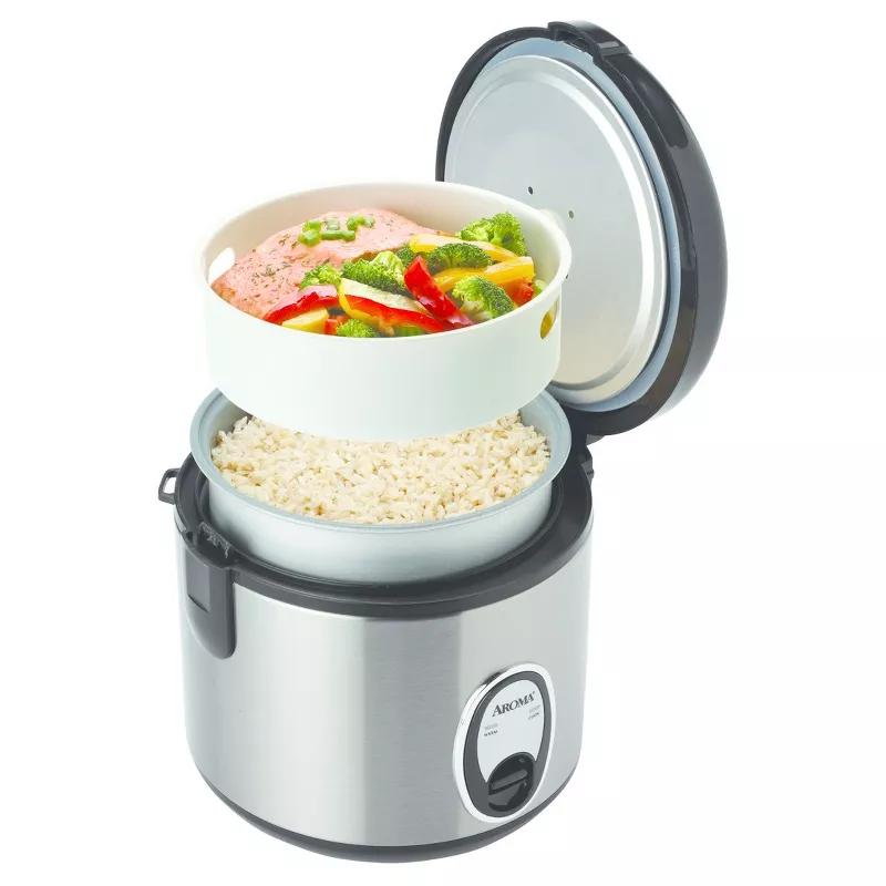 Easily prepare up to 8 cups of cooked rice in this Aroma Rice Cooker. Made of stainless steel with a brushed finish and a cool touch exterior. The cooker has an removable non stick cooking pot and a lid, making cleaning up easy. Includes a steam tray, serving spatula, rice measuring cup and instruction manual. Features a locking lid, keep warm function, condensation collector. Great for rice, chili or soups!