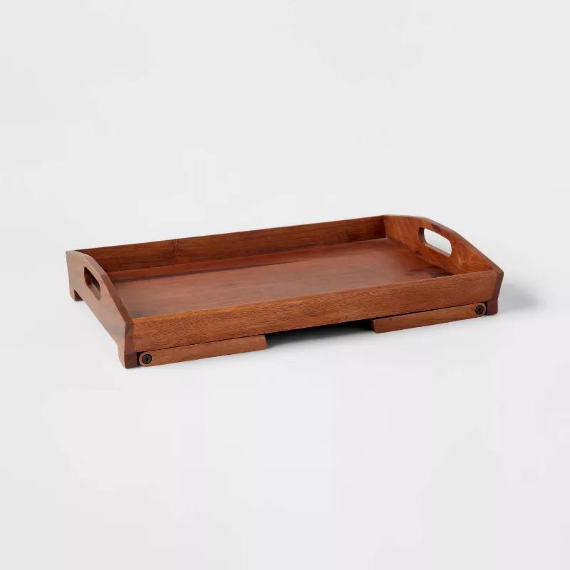 Start your day with a scrumptious breakfast served in bed with the Wooden Signature Bed Tray from Threshold™. Supported on two slanted and foldable legs, this wooden bed tray features a classic rectangular silhouette with raised side walls to help keep the items on it and prevent spillovers. Plus, the side cutout handles make carrying and lifting easy. Crafted from wood in a dark brown finish, it's sure to bring farmhouse-inspired charm to your table decor, pantry or kitchen.